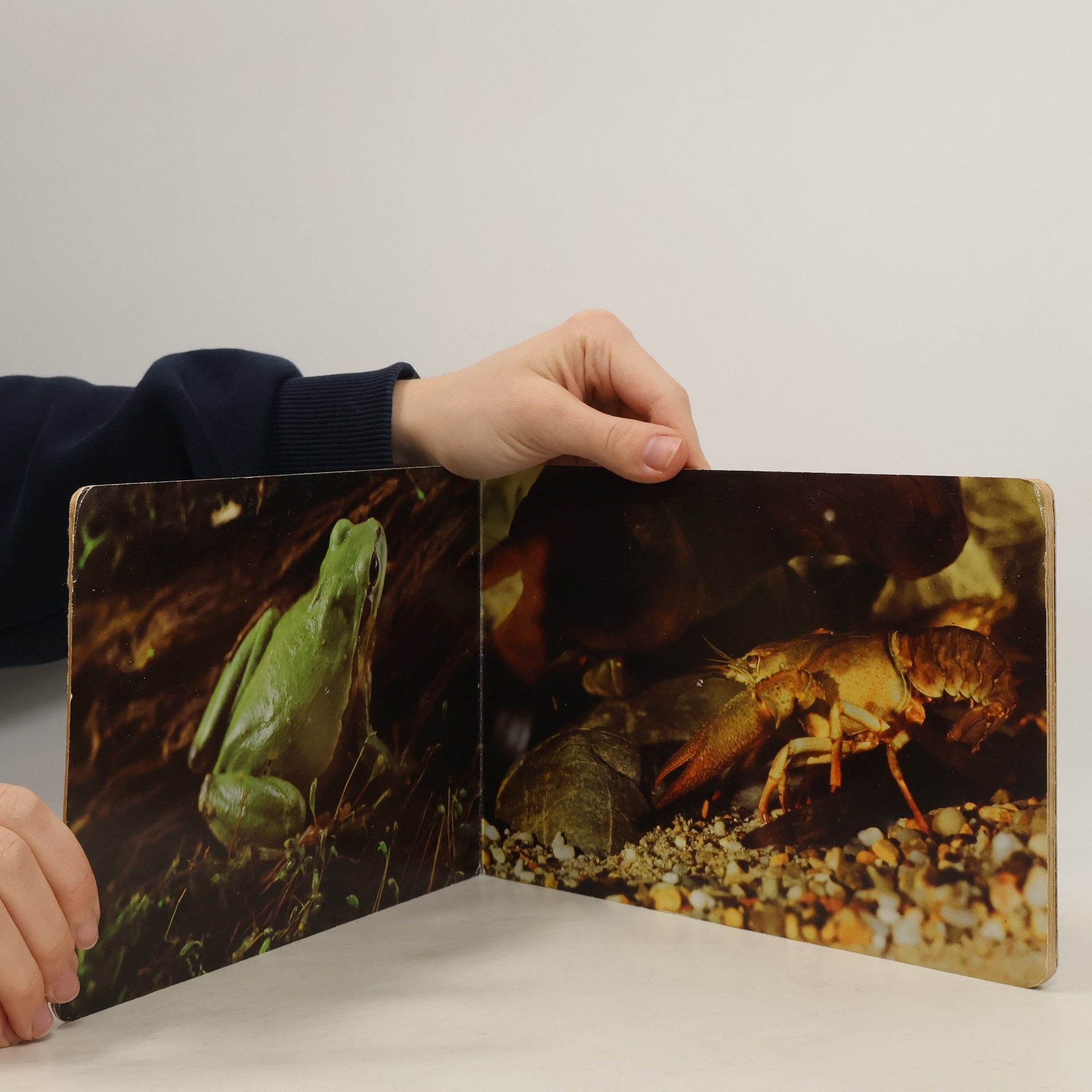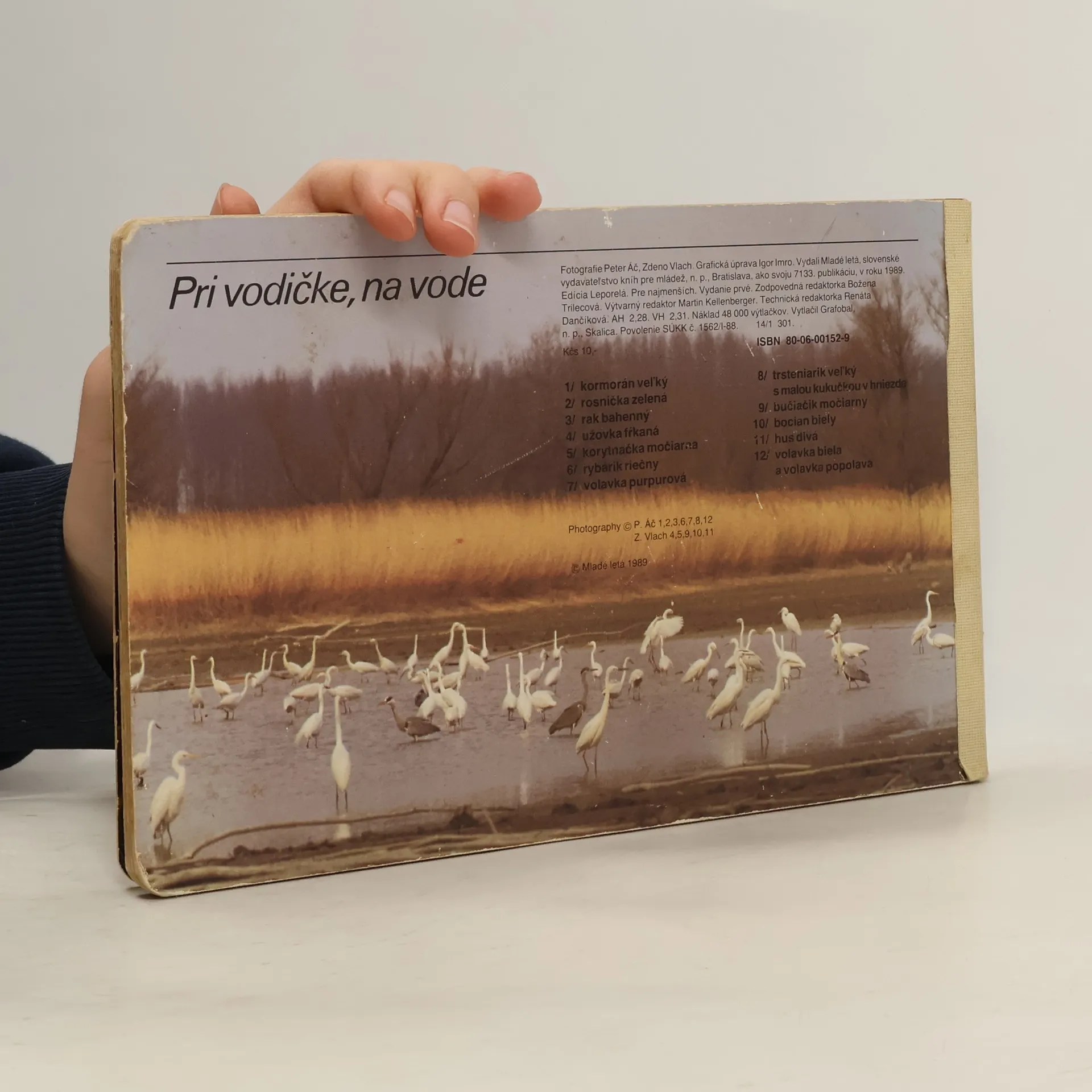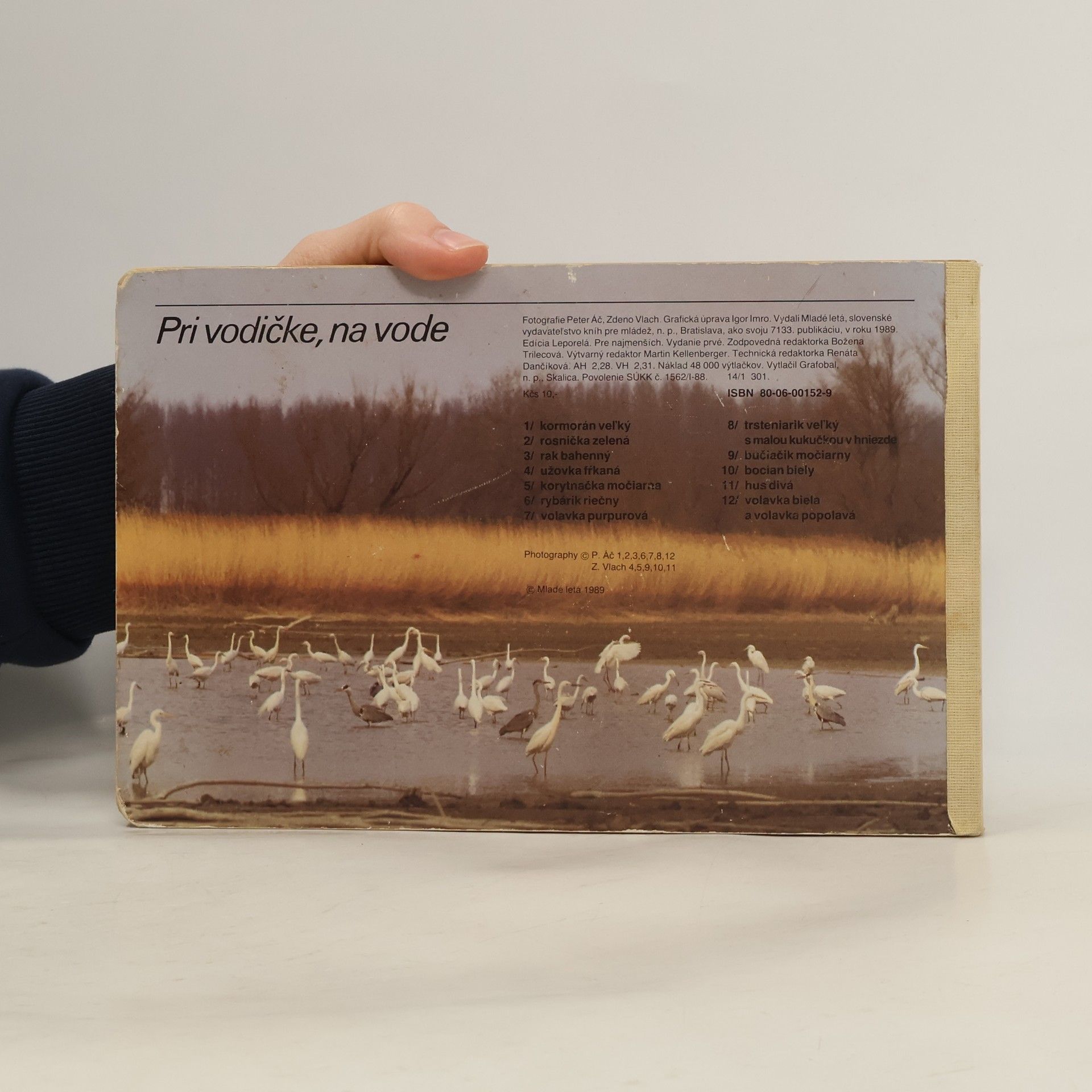 Leporelo s fotografiami zvierat pri vode: Kormorán veľký, Rosnička zelená, Rak bahenný, Užovka fŕkaná, Korytnačka močiarna, Rybárik riečny, Volavka purpurová, Trsteniarik veľký s malou kukučkou v hniezde, Bučiačik močiarny, Bocian biely, Hus divá, Volavka biela a volavka popolavá.