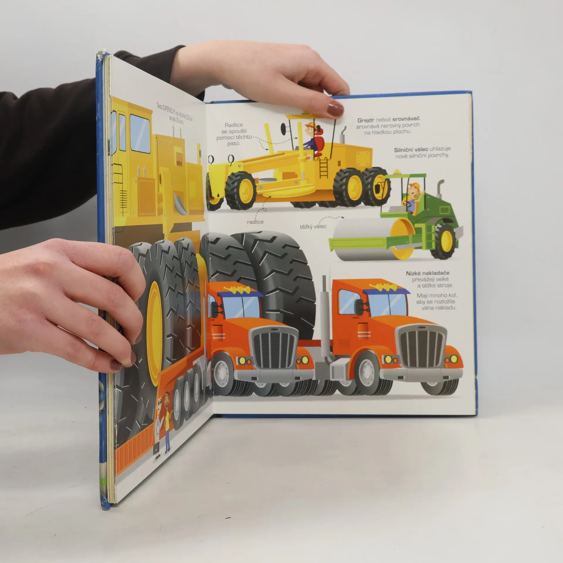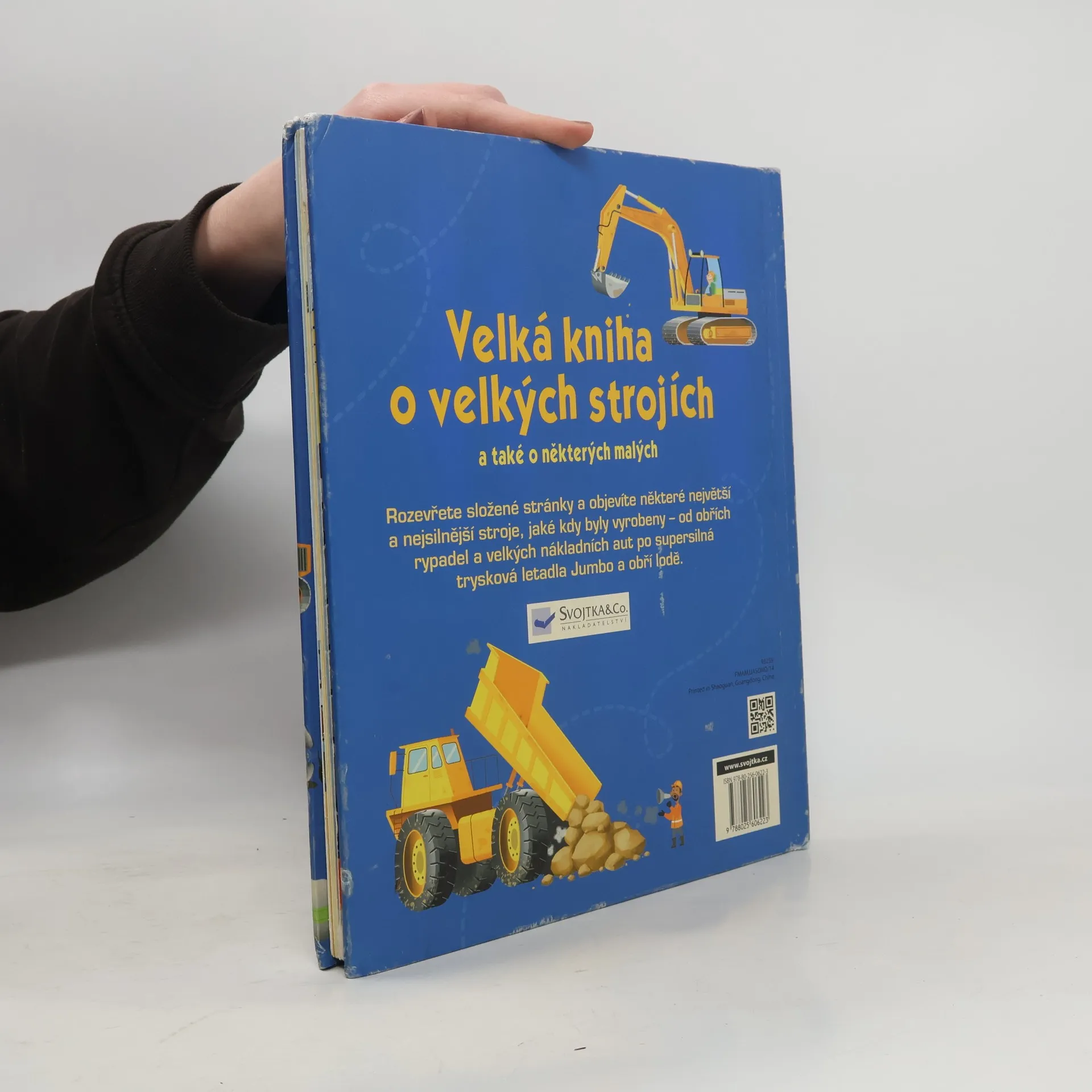 Rozkládací obrázková publikace plná velkých i malých strojů. Najdeme zde silniční vozidla, různá rypadla, stavební, zemědělské nebo i důlní či přístavní stroje. Také ukázku, které z nich jsou největší, nejdelší a nejrychlejší. Vhodné pro děti kolem 5 let.