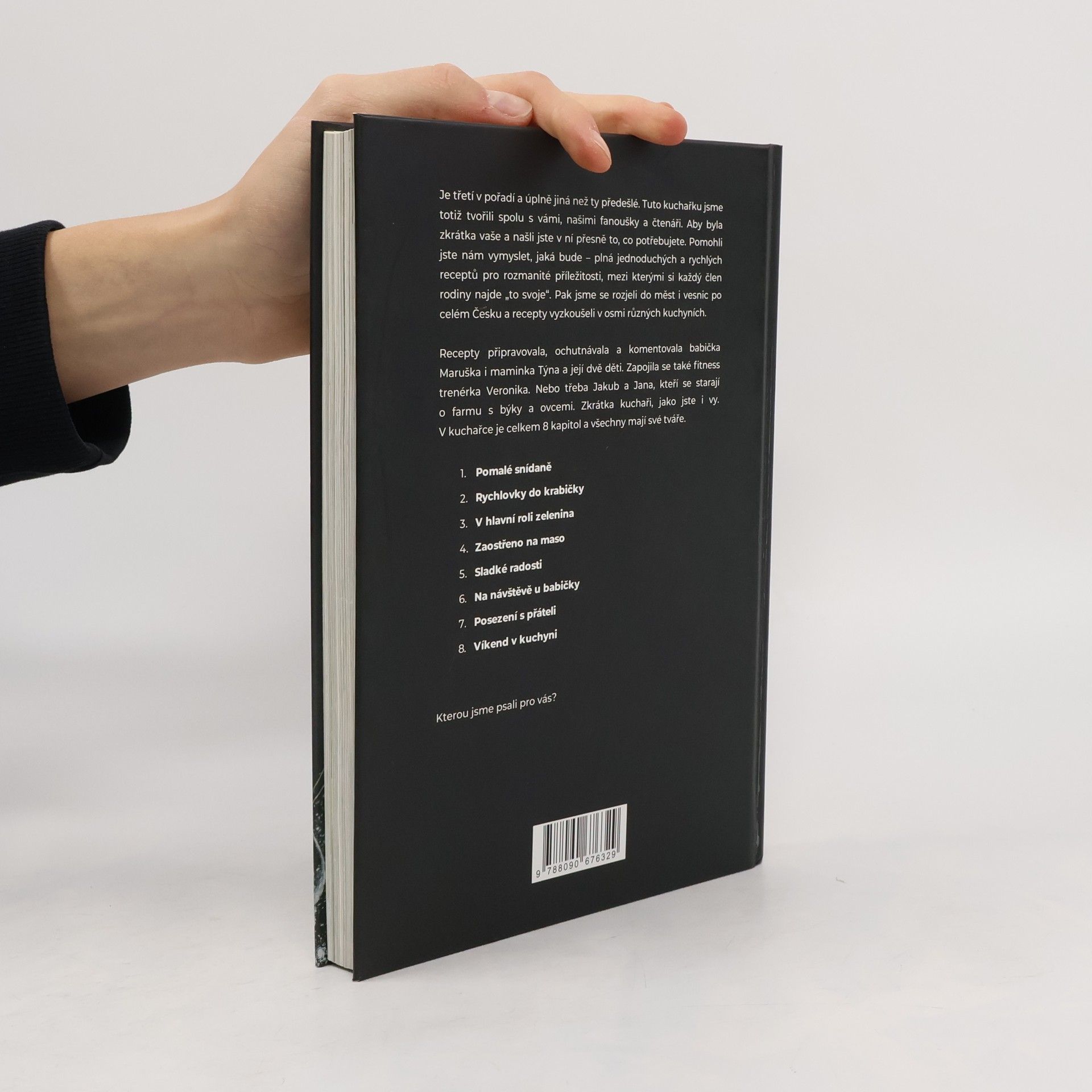 Máme za sebou pěkný kus cesty. Slíbili jsme, že připravíme kuchařku podle vašich přání. Tak jsme pracovali 8 měsíců, ujeli 1 438 kilometrů, vařili v osmi kuchyních po různých koutech Česka – a nezapomněli se radit s vámi. Děkujeme vám za pomoc a podporu! V kuchařce najdete od každého něco – péct budete s mámou Týnou a jejími dětmi. S babičkou Maruškou a její vnučkou ochutnáte tradiční recepty v netradiční podobě. A s fitness trenérkou Verčou se podíváte na to, jaké recepty si můžete zabalit s sebou do krabičky. V celkem 8 kapitolách najdete 110 receptů pro různé příležitosti.