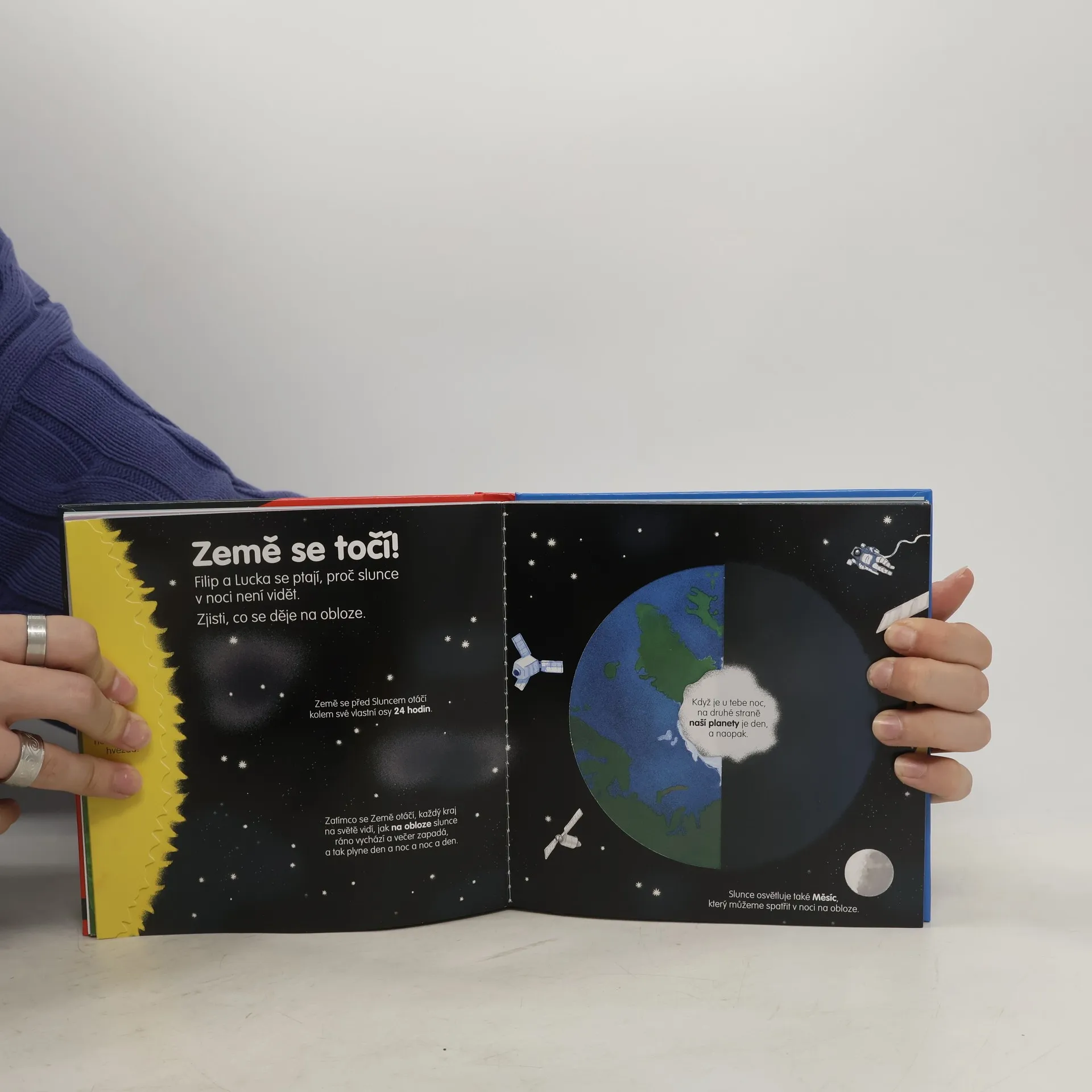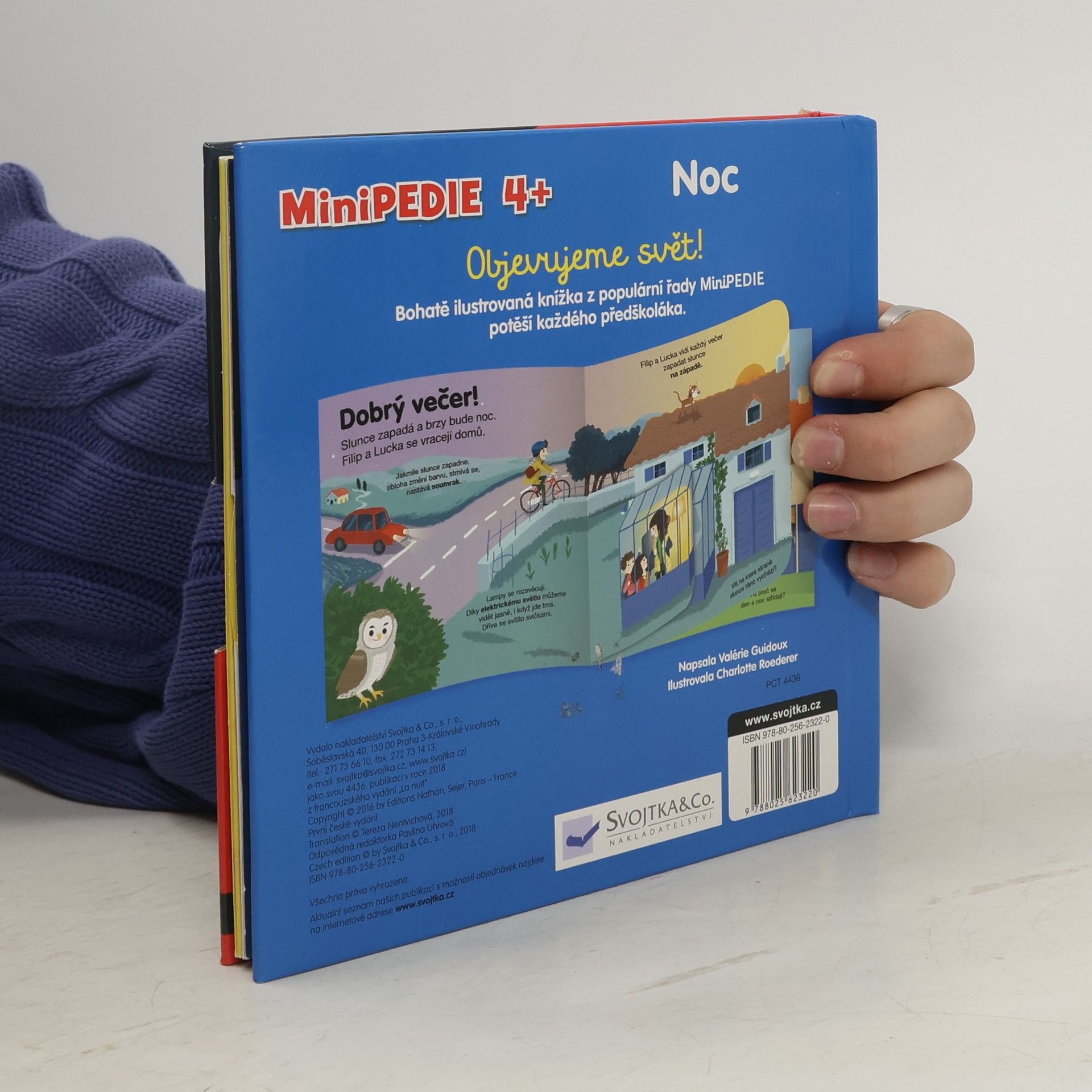 Co se děje, když spíme? A proč se Měsíc mění? Zjisti, k čemu slouží teleskop, a zkus sledovat hvězdy na noční obloze pomocí dalekohledu. Která zvířata jsou v noci vzhůru a co dělají? Vzhůru jsou taky lidé, kteří v noci pracují – třeba lékaři. A kdo upekl voňavé pečivo, které máš ráno ke snídani? Kniha pro děti od čtyř let je plná odklápěcích okének a pohyblivých prvků, díky nimž si dítě procvičí i jemnou motoriku. Knížka s prvky Montessori. České vydání publikace nakladatelství Nathan.
