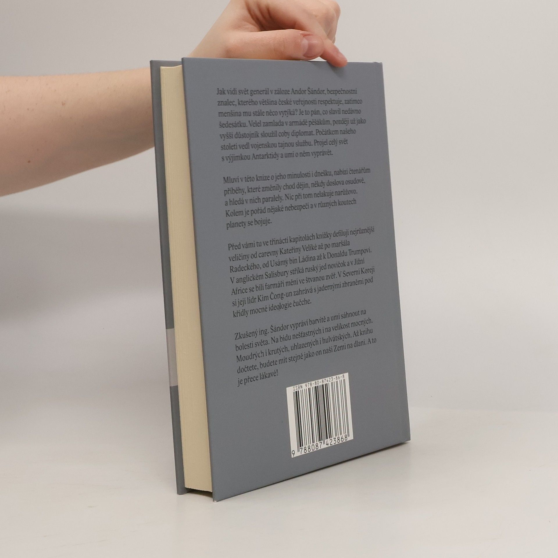 Jak vidí svět generál v záloze Andor Šándor, bezpečnostní znalec, kterého většina české veřejnosti respektuje, zatímco menšina mu stále něco vytýká? Je to pán, co slavil nedávno šedesátku. Velel zamlada v armádě pěšákům, později už jako vyšší důstojník sloužil coby diplomat. Počátkem našeho století vedl vojenskou tajnou službu. Projel celý svět s výjimkou Antarktidy a umí o něm vyprávět. Mluví v této knize o jeho minulosti i dnešku, nabízí čtenářům příběhy, které změnily chod dějin, někdy doslova osudově, a hledá v nich paralely. Nic při tom nelakuje narůžovo. Kolem je pořád nějaké nebezpečí a v různých koutech planety se bojuje. Před vámi tu ve třinácti kapitolách knížky defilují nejrůznější veličiny od carevny Kateřiny Veliké až po maršála Radeckého, od Usámy bin Ládina až k Donaldu Trumpovi. V anglickém Salisbury stříká ruský jed novičok a v Jižní Africe se bílí farmáři mění ve štvanou zvěř. V Severní Koreji si její lídr Kim Čong-un zahrává s jadernými zbraněmi pod křídly mocné ideologie čučche. Zkušený ing. Šándor vypráví barvitě a umí sáhnout na bolesti světa. Na bídu nešťastných i na velikost mocných. Moudrých i krutých, uhlazených i hulvátských. Až knihu dočtete, budete mít stejně jako on naši Zemi na dlani. A to je přece lákavé!