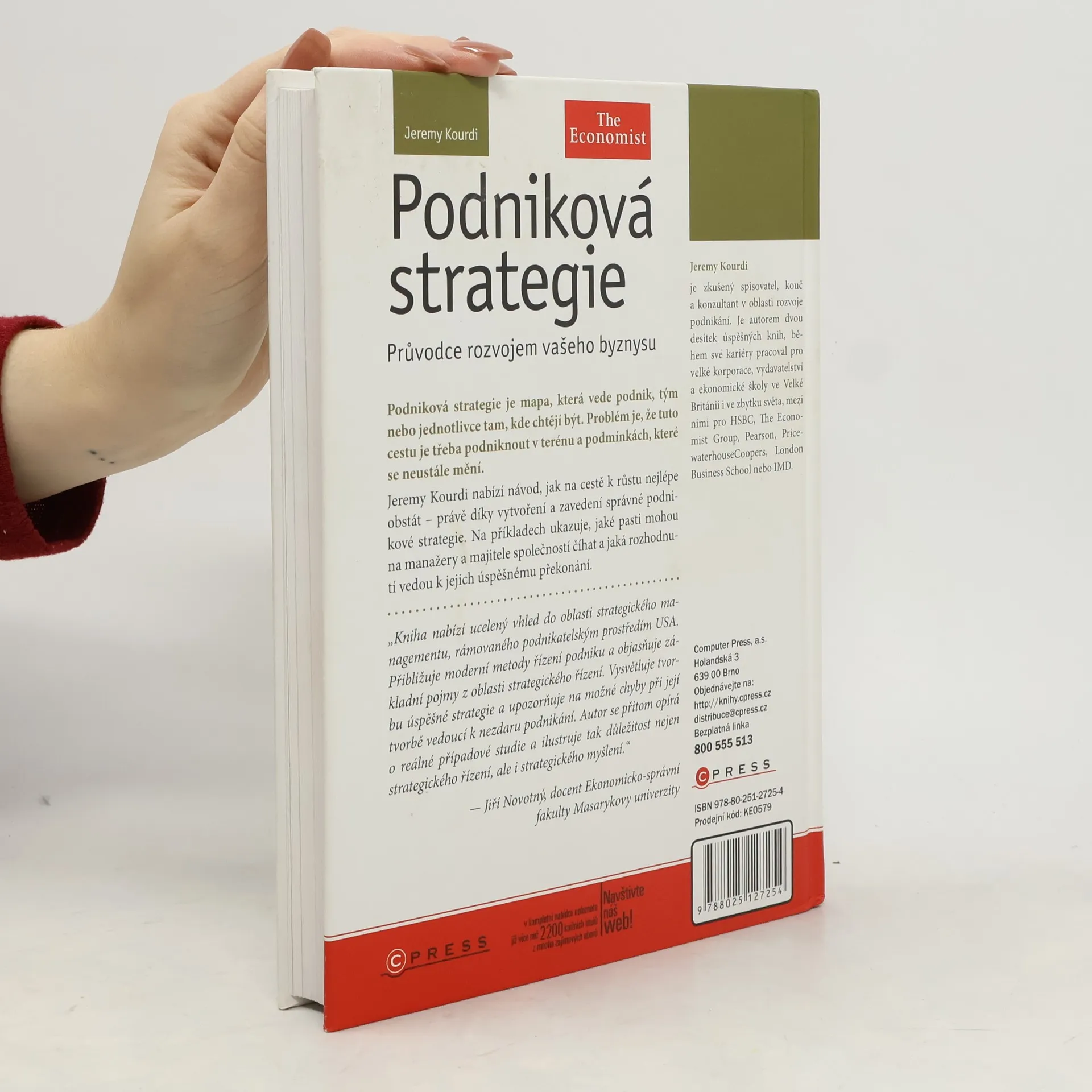 Podniková strategie je mapa, která vede podnik, tým nebo jednotlivce tam, kde chtějí být. Problém je, že tuto cestu je třeba podniknout v terénu a podmínkách, které se neustále mění. Jeremy Kourdi nabízí návod, jak na cestě k růstu nejlépe obstát – právě díky vytvoření a zavedení správné podnikové strategie. Na příkladech ukazuje, jaké pasti mohou na manažery a majitele společností číhat a jaká rozhodnutí vedou k jejich úspěšnému překonání. „Kniha nabízí ucelený vhled do oblasti strategického managementu, rámovaného podnikatelským prostředím USA. Přibližuje moderní metody řízení podniku a objasňuje základní pojmy z oblasti strategického řízení. Vysvětluje tvorbu úspěšné strategie a upozorňuje na možné chyby při její tvorbě vedoucí k nezdaru podnikání.Autor se přitom opírá o reálné případové studie a ilustruje tak důležitost nejen strategického řízení, ale i strategického myšlení.“ – Jiří Novotný, docent Ekonomicko-správní fakulty Masarykovy univerzity Jeremy Kourdi je zkušený spisovatel, kouč a konzultant v oblasti rozvoje podnikání. Je autorem dvou desítek úspěšných knih, během své kariéry pracoval pro velké korporace, vydavatelství a ekonomické školy ve Velké Británii i ve zbytku světa, mezi nimi pro HSBC, The Economist Group, Pearson, PricewaterhouseCoopers, London Business School nebo IMD.