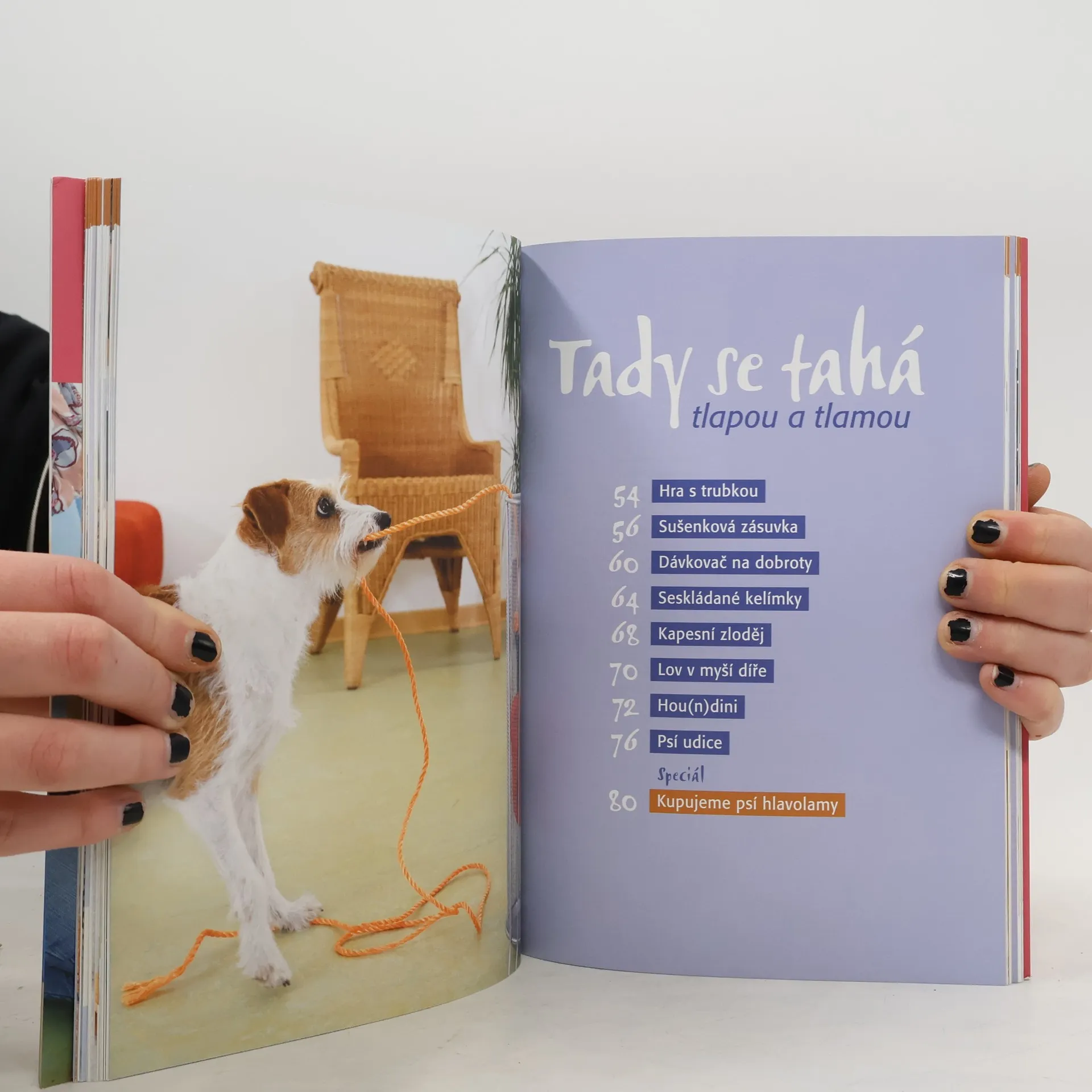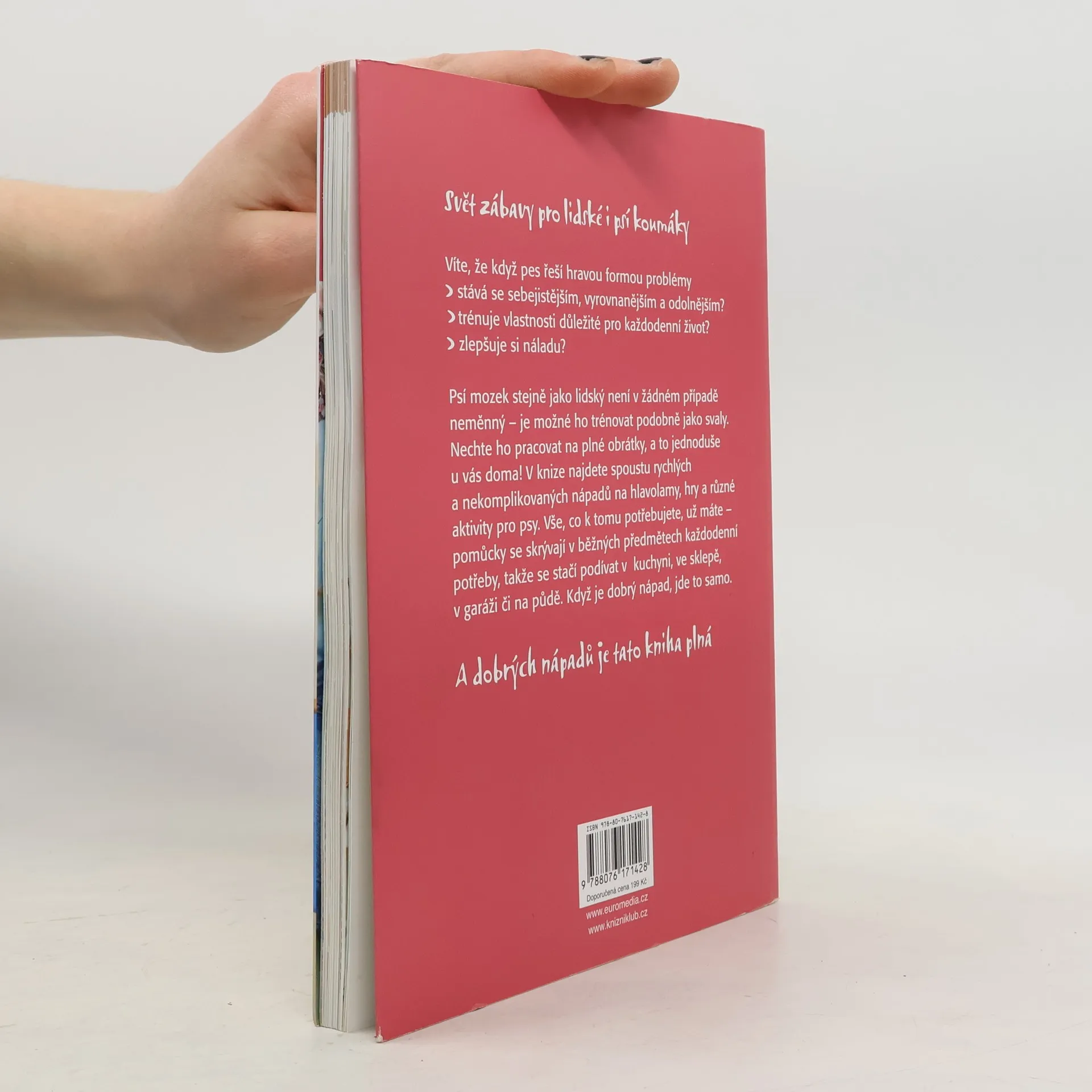 Kniha nabízí řadu praktických návodů, jak důkladně procvičit šedou kůru mozkovou vašeho čtyřnohého kamaráda. A nemusíte nic kupovat: pomůcky pro nekonečnou zábavu s hlavolamy už máte doma. Skrývají se v předmětech každodenní potřeby v kuchyni, ve sklepě, v garáži a na půdě a čekají jen na nápad, jak je použít. Bohatě ilustrovaná publikace uvádí množství originálních her, při kterých pes musí použít tlapu, čenich a do velké míry zapojit i hlavu. Aby se dostal k pamlsku nebo oblíbené hračce, nezbývá mu než přijít na kloub různým mechanismům: například ovládat kousek rourky, zkusit štěstí ve hrách s kloboučky na různých podložkách, vytáhnout psí udici nebo – v pravém smyslu slova – myslet za roh... Vítejte v dílně na hlavolamy.