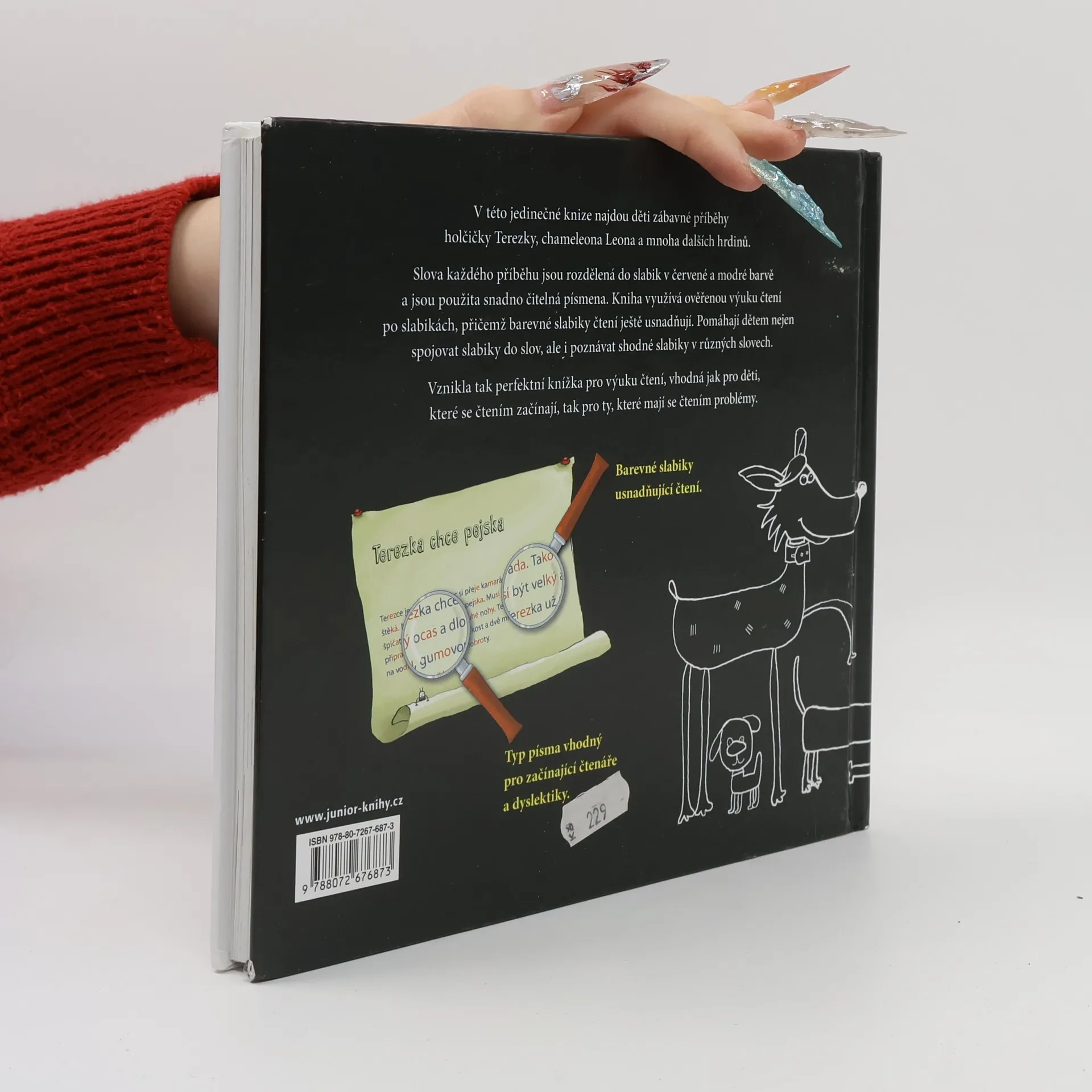 V této jedinečné knize najdou děti zábavné příběhy holčičky Terezky, chameleona Leona a mnoha dalších hrdinů. Slova každého příběhu jsou rozdělená do slabik v červené a modré barvě a jsou použita snadno čitelná písmena. Kniha využívá ověřenou výuku čtení po slabikách, přičemž barevné slabiky čtení ještě usnadňují. Pomáhají dětem nejen spojovat slabiky do slov, ale i poznávat shodné slabiky v různých slovech. Vznikla tak perfektní knížka pro výuku čtení, vhodná jak pro děti, které se čtením začínají, tak pro ty, které mají se čtením problémy. Pro děti od šesti let.