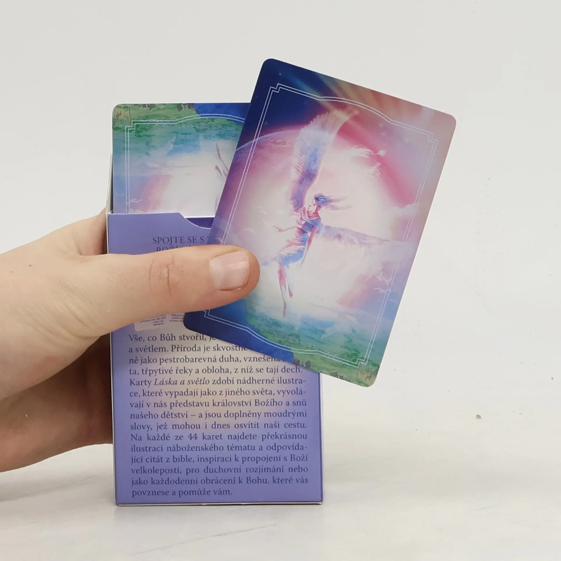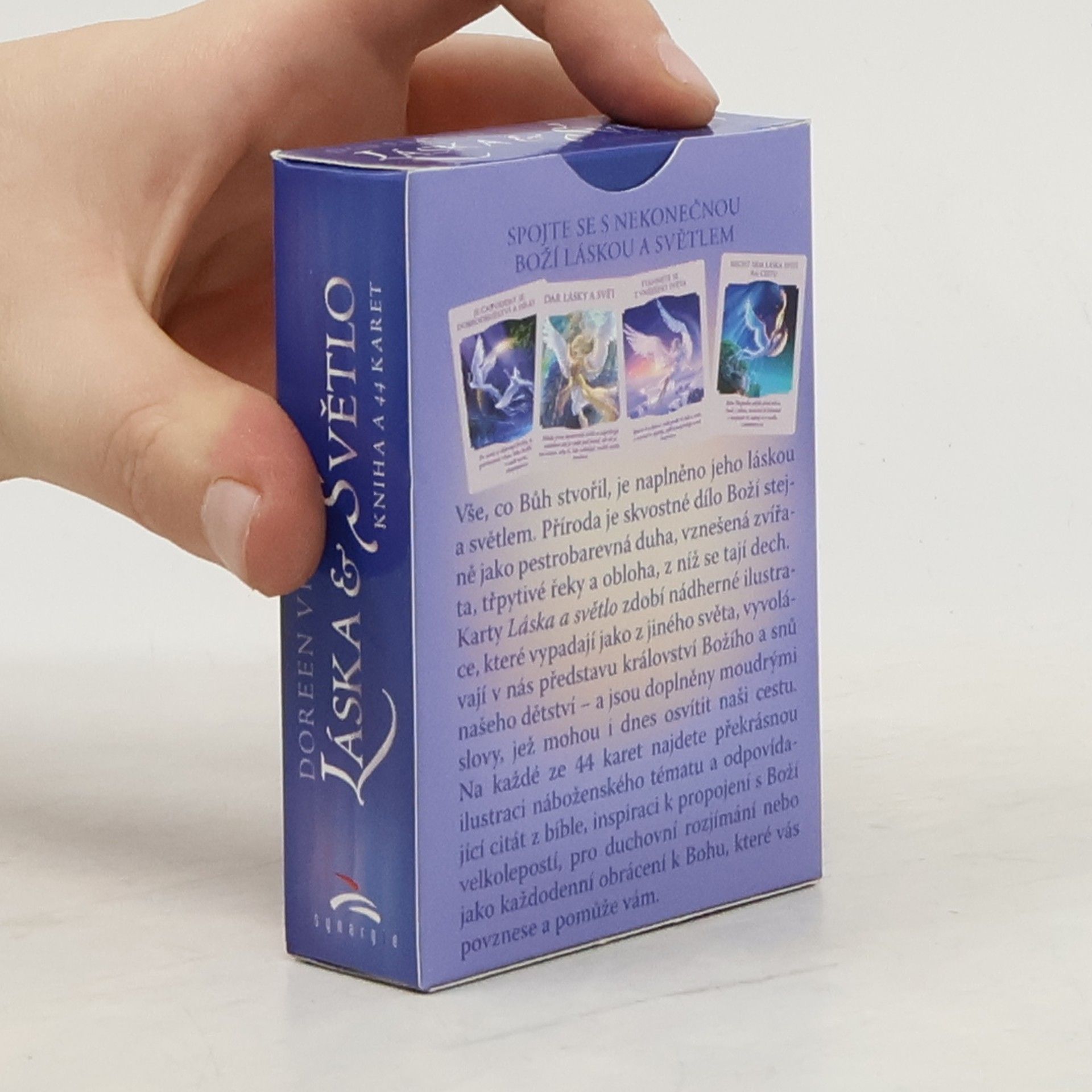 Vše, co Bůh stvořil, je naplněno jeho láskou a světlem. Příroda je skvostné dílo Boží stejně jako pestrobarevná duha, vznešená zvířata, třpytivé řeky a obloha, z níž se tají dech. Karty Láska a světlo zdobí nádherné ilustrace, které vypadají jako z jiného světa, vyvolávají v nás představu království Božího a snů našeho dětství – a jsou doplněny moudrými slovy, jež mohou i dnes osvítit naši cestu. Na každé ze 44 karet najdete překrásnou ilustraci náboženského tématu a odpovídající citát z bible, inspiraci k propojení s Boží velkolepostí, pro duchovní rozjímání nebo jako každodenní obrácení se k Bohu, které vás povznese.