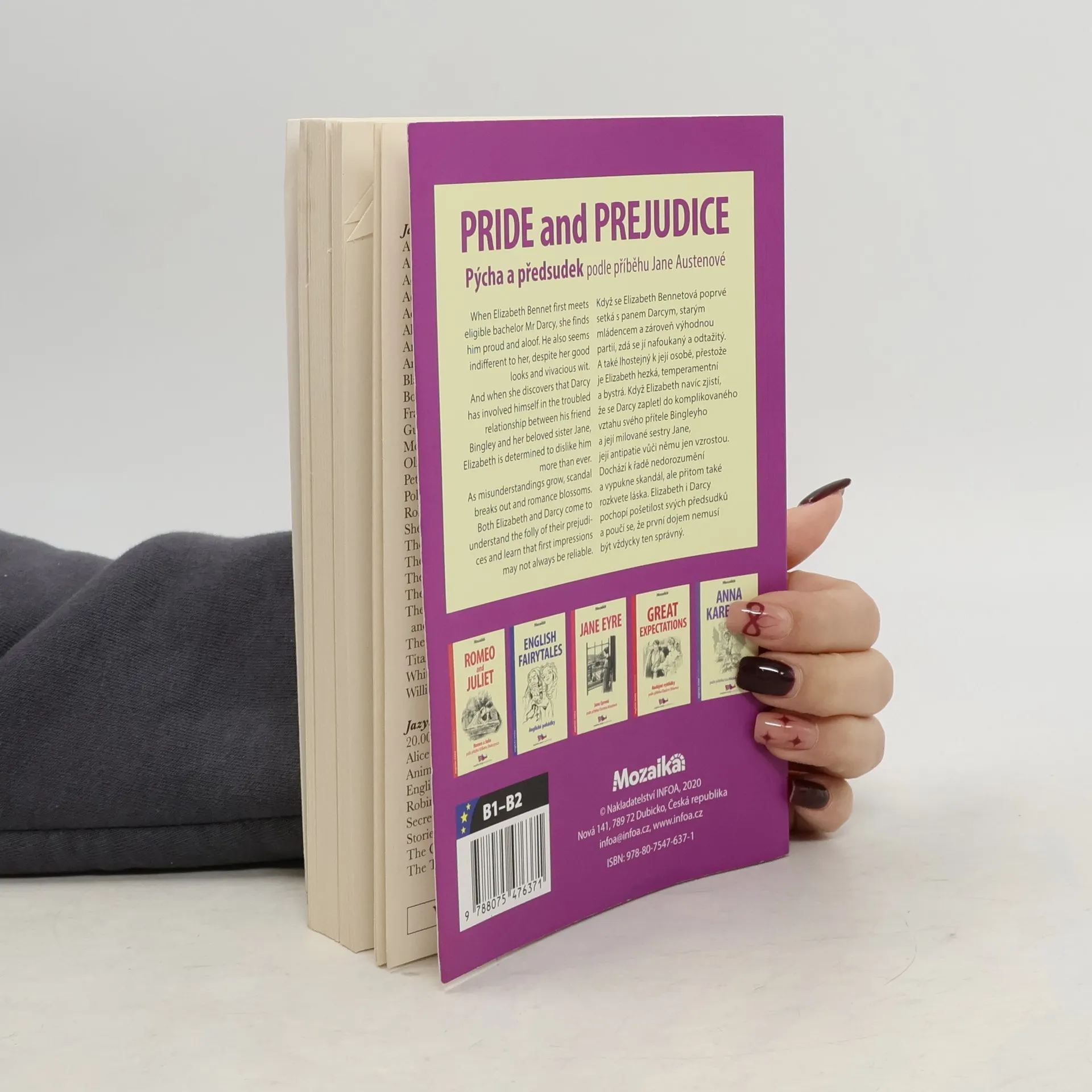 Když se Elizabeth Bennetová poprvé setká s panem Darcym, starým mládencem a zároveň výhodnou partií, zdá se jí nafoukaný a odtažitý. A také lhostejný k její osobě, přestože je Elizabeth hezká, temperamentní a bystrá. Když Elizabeth navíc zjistí, že se Darcy zapletl do komplikovaného vztahu svého přítele Bingleyho a její milované sestry Jane, její antipatie vůči němu jen vzrostou. Dochází k řadě nedorozumění a vypukne skandál, ale přitom také rozkvete láska. Elizabeth i Darcy pochopí pošetilost svých předsudků a poučí se, že první dojem nemusí být vždycky ten správný. V angličtině, pro čtenáře, kteří se učí anglicky.