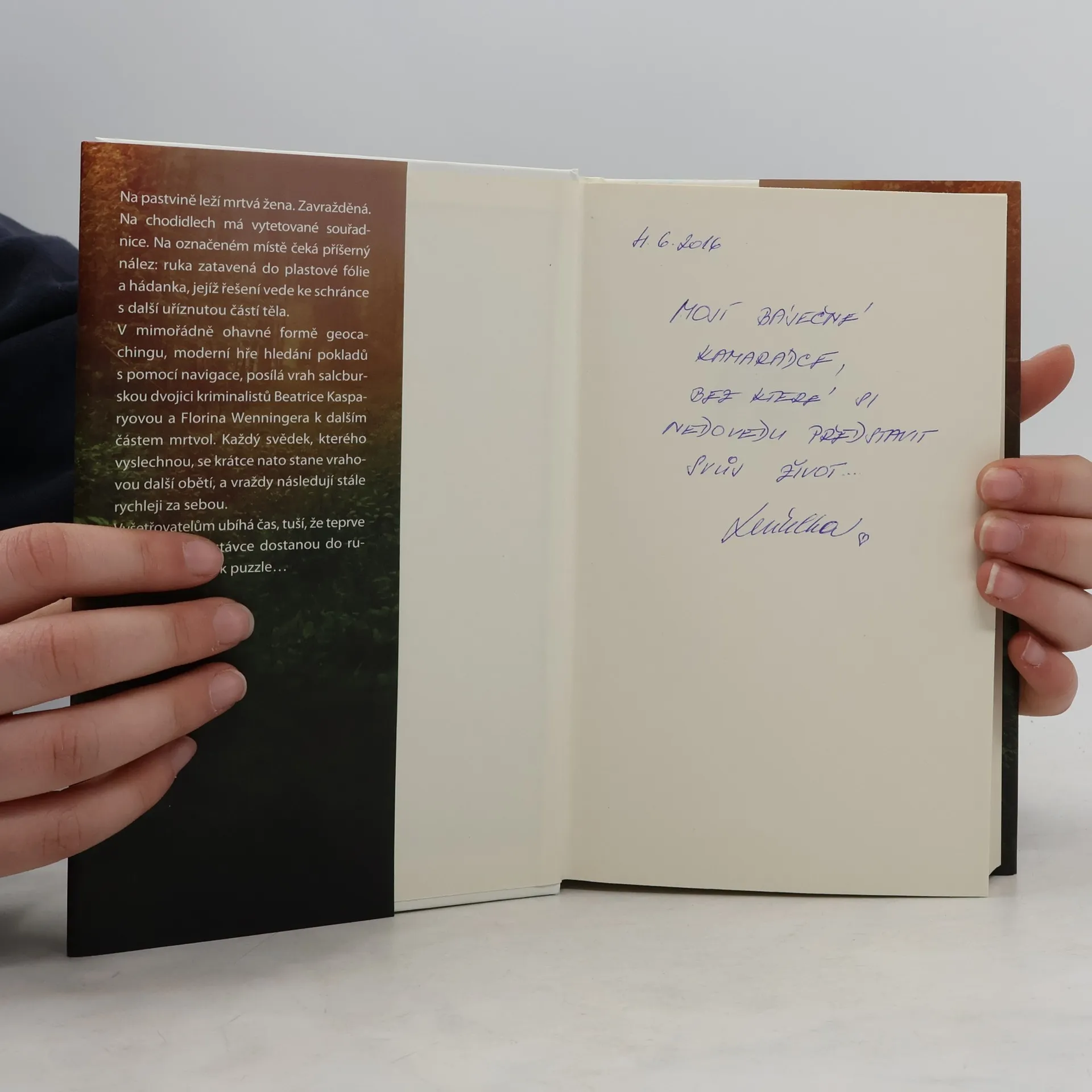 Na pastvině leží mrtvá žena. Zavražděná. Na chodidlech má vytetované souřadnice. Na označeném místě čeká příšerný nález: ruka zatavená do plastové fólie a hádanka, jejíž řešení vede ke schránce s další uříznutou částí těla. V mimořádně ohavné formě geocachingu, moderní hře hledání pokladů s pomocí navigace, posílá vrah dvojici kriminalistů k dalším částem mrtvol. Vyšetřovatelům ubíhá čas, tuší, že teprve na poslední zastávce dostanou do rukou zásadní dílek puzzle…