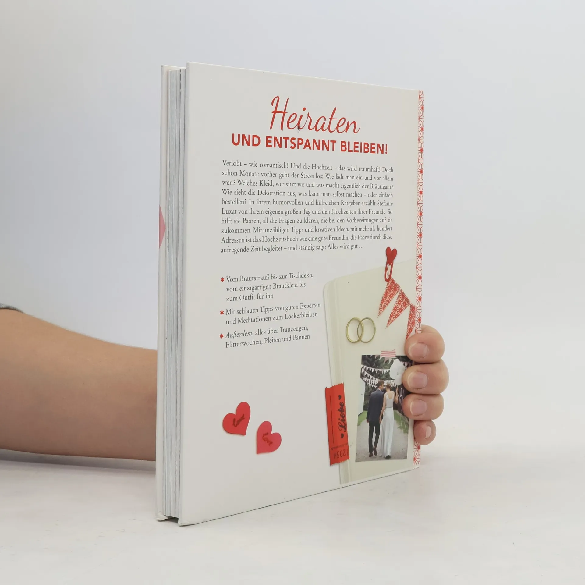 Heiraten und entspannt bleiben! Verlobt – wie romantisch! Und die Hochzeit – das wird traumhaft! Doch schon Monate vorher geht der Stress los: Wie lädt man ein und vor allem wen? Welches Kleid, wer sitzt wo, und was macht eigentlich der Bräutigam? Wie sieht die Dekoration aus, was kann man selbst machen – oder einfach bestellen? Der humorvolle Ratgeber von BRIGITTE-Autorin Stefanie Luxat mit vielen Tipps, Tricks und Geschichten aus dem wahren Leben. Der schönste Tag im Leben soll es werden. Die attraktivste Braut aller Zeiten, der herzallerliebste Bräutigam, ein rauschendes Fest, glückliche Gäste … Doch bei der Planung mischen sich unweigerlich alle ein, und das Brautpaar vergisst, was es eigentlich selbst wollte. Die Erfahrung hat auch BRIGITTE-Autorin Stefanie Luxat gemacht und sich gefragt: Warum sagt einem das keiner vorher? So entstand dieses Hochzeitsbuch, mit dem beides gelingt: heiraten und entspannt bleiben! Ehrlich und unterhaltsam erzählt sie von ihrem eigenen großen Tag und den Hochzeiten ihrer Freunde (inklusive aller Pannen!) und hilft Paaren, all die Fragen zu klären, die bei den Vorbereitungen auf sie zukommen. Mit unzähligen Tipps und kreativen Ideen, mit mehr als 100 Adressen ist dieses Hochzeitsbuch wie eine gute Freundin, die Paare durch diese aufregende Zeit begleitet – und ständig sagt: Alles wird gut …