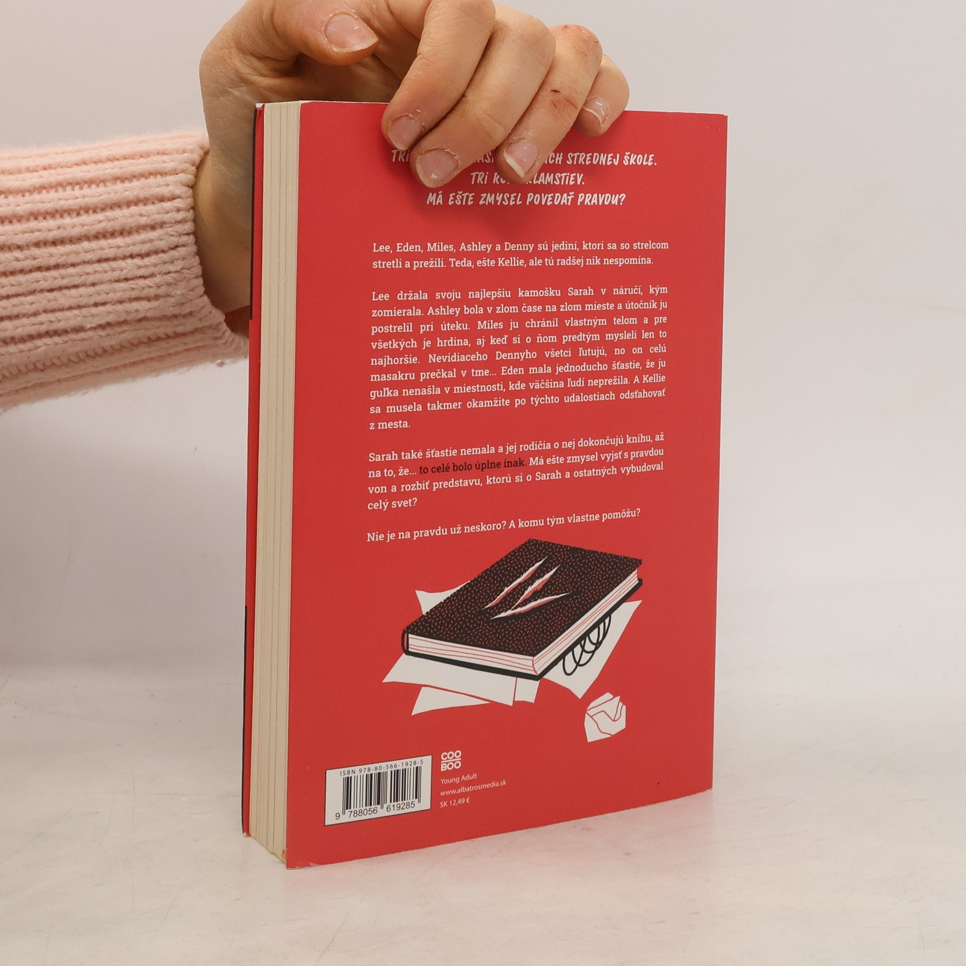 Tri roky po masakre na ich strednej škole. Tri roky klamstiev. Má ešte zmysel povedať pravdu? Lee, Eden, Miles, Ashley a Denny sú jediní, ktorí sa so strelcom stretli a prežili. Teda, ešte Kellie, ale tú radšej nik nespomína. Lee držala svoju najlepšiu kamošku Sarah v náručí, kým zomierala. Ashley bola v zlom čase na zlom mieste a útočník ju postrelil pri úteku. Miles ju chránil vlastným telom a pre všetkých je hrdina, aj keď si o ňom predtým mysleli len to najhoršie. Nevidiaceho Dennyho všetci ľutujú, no on celú masakru prečkal v tme... Eden mala jednoducho šťastie, že ju guľka nenašla v miestnosti, kde väčšina ľudí neprežila. A Kellie sa musela takmer okamžite po týchto udalostiach odsťahovať z mesta. Sarah také šťastie nemala a jej rodičia o nej dokončujú knihu, až na to, že... to celé bolo úplne inak. Má ešte zmysel vyjsť s pravdou von a rozbiť predstavu, ktorú si o Sarah a ostatných vybudoval celý svet? Nie je na pravdu už neskoro? A komu tým vlastne pomôžu? Výnimočný príbeh od autorky románu The Duff. To pravé pre fanúšikov kníh Jeden z nás klame, Farby smútku a Mŕtve dievča neklame.