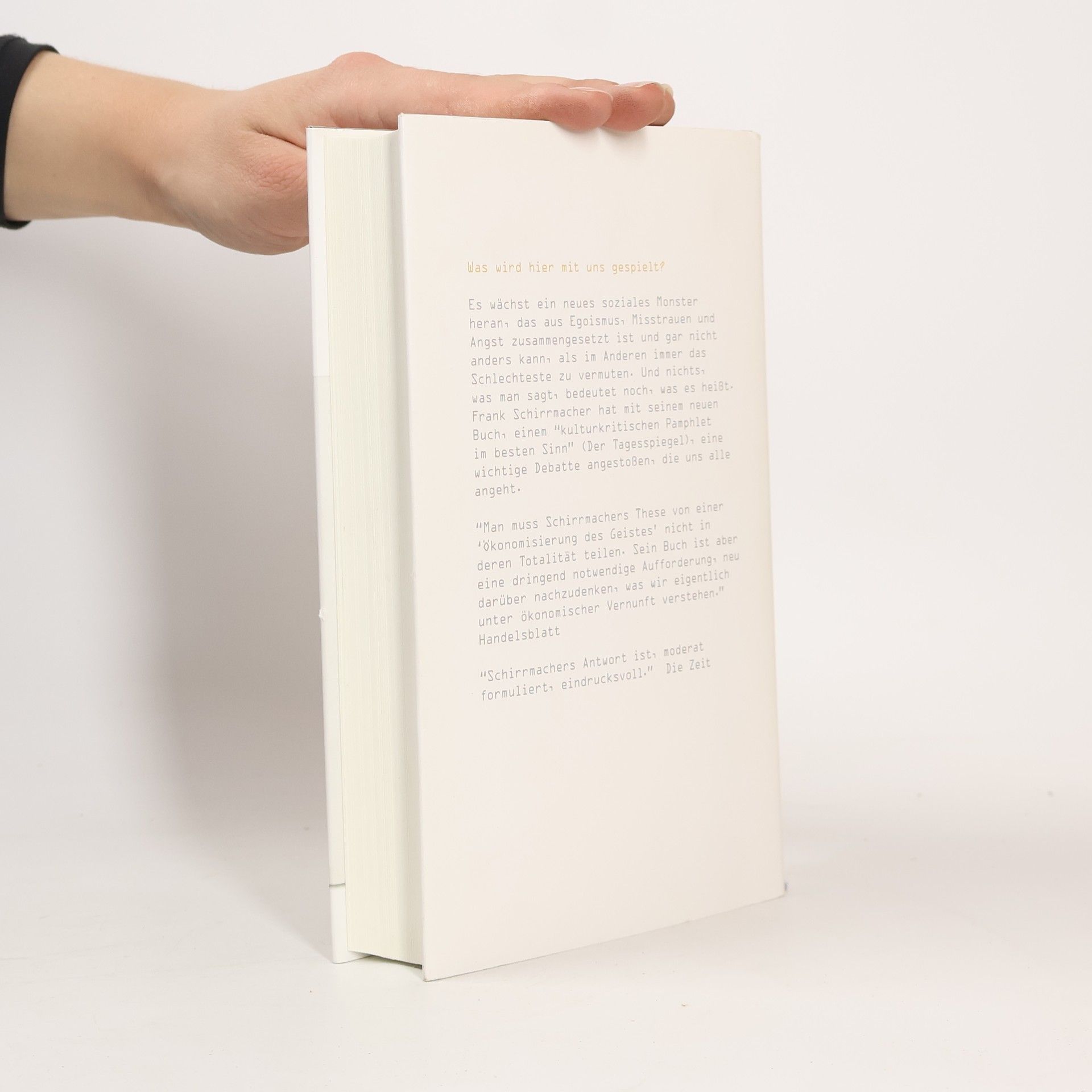 Dieses Buch erzählt davon, wie nach dem Ende des Kalten Kriegs ein neuer Kalter Krieg im Herzen unserer Gesellschaft eröffnet wird. Es ist die Geschichte einer Manipulation: Vor sechzig Jahren wurde von Militärs und Ökonomen das theoretische Model eines Menschen entwickelt. Ein egoistisches Wesen, das nur auf das Erreichen seiner Ziele, auf seinen Vorteil und das Austricksen der anderen bedacht war: ein moderner Homo oeconomicus. Nach seiner Karriere im Kalten Krieg wurde er nicht ausgemustert, sondern eroberte den Alltag des 21. Jahrhunderts. Aktienmärkte werden heute durch ihn gesteuert, Menschen ebenso. Er will in die Köpfe der Menschen eindringen, um Waren und Politik zu verkaufen. Das Modell ist zur selbsterfüllenden Prophezeiung geworden. Der Mensch ist als Träger seiner Entscheidungen abgelöst, das große Spiel des Lebens läuft ohne uns. Frank Schirrmacher zeichnet in seinem bahnbrechenden neuen Buch die Spur eines monströsen Doppelgängers nach und macht klar, dass die Konsequenzen seines Spiels das Ende der Demokratie sein könnte, wie wir sie heute kennen.