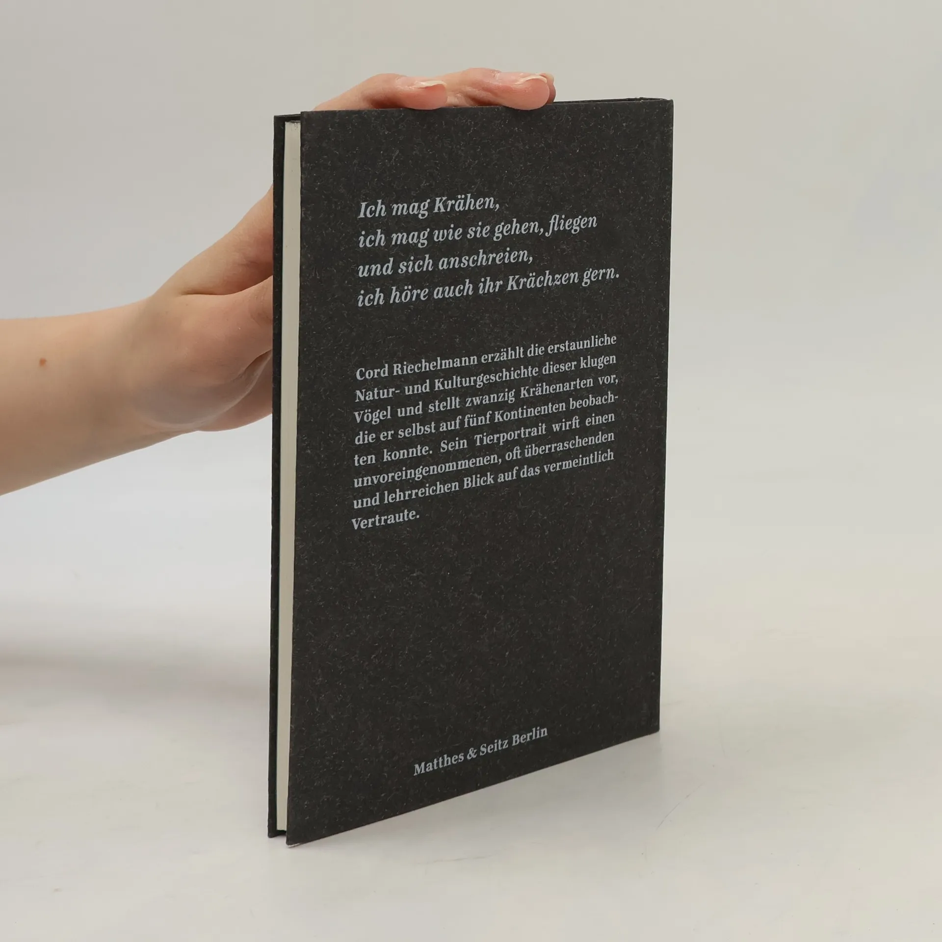 Die Familie der Krähen, wissenschaftlich Corvidae, ist eine in der Entwicklungsgeschichte der Singvögel relativ junge Familie. Sie umfasst 123 Arten, zu denen auch Elstern und Häher zählen; ihre engsten Verwandten sind die Paradiesvögel. Anders als diese kommen die meist schwarz gefärbten Krähen beinahe überall auf der Erde vor. Die Mythen, die sie von jeher begleiten, sind ebenso dunkel wie sie und handeln fast immer von Übel und Tod. Selbst die zunehmende Erforschung ihrer herausragenden Intelligenz konnte sie nicht von ihrem schlechten Ruf befreien. Im Gegenteil: Dass Krähen über ein Gedächtnisvermögen verfügen, das sogar jede menschliche Kapazität übersteigt, scheint nur ein weiterer Ausweis ihrer Unheimlichkeit zu sein. Cord Riechelmann, »der einzige wirkliche Tierjournalist, den wir haben« (Jakob Augstein), erzählt die erstaunliche Natur- und Kulturgeschichte dieser klugen Vögel und stellt zwanzig Krähenarten vor, die er selbst auf fünf Kontinenten beobachten konnte. Sein Tierportrait vermittelt nichts weniger als den unvoreingenommenen Blick auf das scheinbar Vertraute.