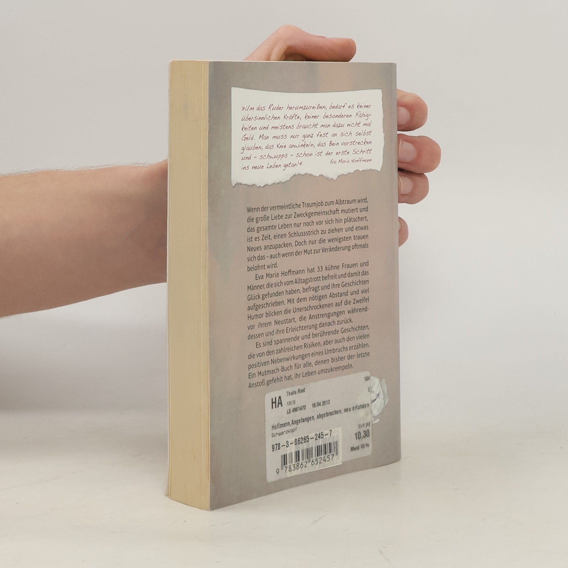 Die 33 Menschen, die Eva Maria Hoffmann ihre Geschichte anvertraut haben, waren an einem Punkt in ihrem Leben angelangt, an dem sie sich fragen mussten: weitermachen wie bisher oder etwas ändern und dabei Gefahr laufen, alles zu verlieren? In Angefangen, abgebrochen, neu erfunden erzählen sie, warum sie sich für einen Neustart entschieden haben und wohin er sie geführt hat. So zum Beispiel Cornelia, die 140 Kilo wog und radikal abnahm, obwohl ihr Freund jedes Gramm an ihr liebte. Oder Lotte, die erkannte, dass sie doch nicht zur Biochemikerin taugt, und kurzerhand nicht mehr zur Arbeit ging. Und Gregor, der nach unzähligen One-Night-Stands verstand, dass Sex eben doch nicht alles ist, und seither nur noch eine einzige Frau in sein Bett lässt. Einige der 33 wahren Geschichten, die Eva Maria Hoffmann zusammengetragen hat, sind anrührend, andere witzig, wieder andere kaum zu glauben – und sie alle zeigen: Wer wagt, der gewinnt auch hin und wieder.