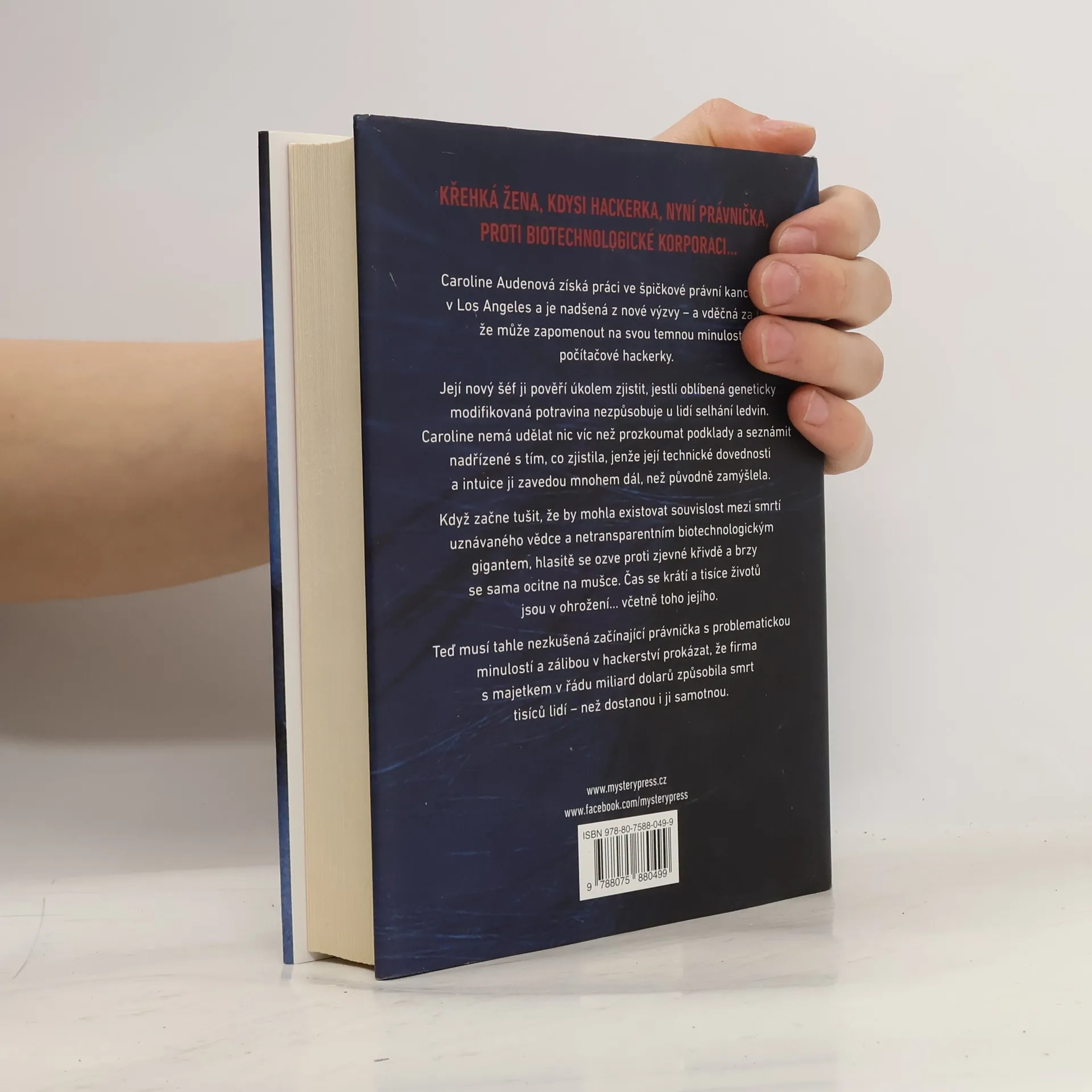 ČÍM VÍC SE SNAŽÍ O SPRAVEDLNOST, TÍM VÍC SE VZDALUJE OD ZÁKONA… Caroline Audenová získá práci ve špičkové právní kanceláři v Los Angeles a je nadšená z nové výzvy – a vděčná za to, že může zapomenout na svou temnou minulost počítačové hackerky. Její nový šéf ji pověří úkolem zjistit, jestli oblíbená geneticky modifikovaná potravina nezpůsobuje u lidí selhání ledvin. Caroline nemá udělat nic víc než prozkoumat podklady a seznámit nadřízené s tím, co zjistila, jenže její technické dovednosti a intuice ji zavedou mnohem dál, než původně zamýšlela. Když začne tušit, že by mohla existovat souvislost mezi smrtí uznávaného vědce a netransparentním biotechnologickým gigantem, hlasitě se ozve proti zjevné křivdě a brzy se sama ocitne na mušce. Čas se krátí a tisíce životů jsou v ohrožení... včetně toho jejího. Teď musí tahle nezkušená začínající právnička s problematickou minulostí a zálibou v hackerství prokázat, že firma s majetkem v řádu miliard dolarů způsobila smrt tisíců lidí – než dostanou i ji samotnou.