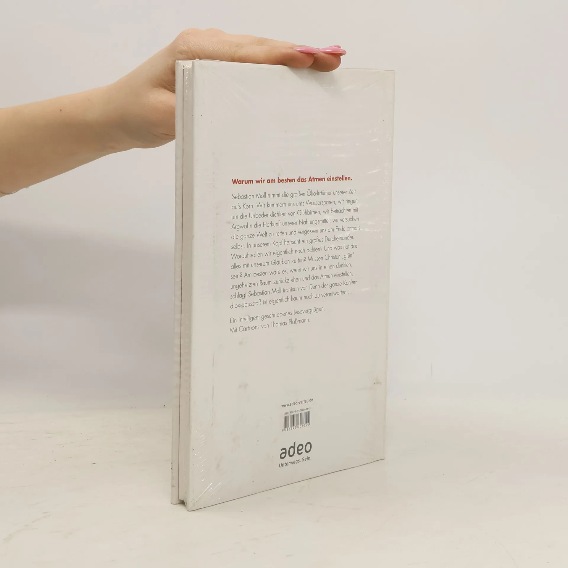 Sebastian Moll nimmt in seinem neuen Buch die großen Öko-Irrtümer unserer Zeit aufs Korn: Wir kümmern uns ums Wassersparen, wir ringen um die Unbedenklichkeit von Glühbirnen, wir betrachten mit Argwohn die Herkunft unserer Nahrungsmittel, wir versuchen die ganze Welt zu retten und vergessen uns am Ende oftmals selbst. In unserem Kopf herrscht ein großes Durcheinander. Auf was sollen wir eigentlich noch alles achten? Und was hat das alles mit unserem Glauben zu tun? Müssen Christen „grün“ sein? Am besten wäre es, wenn wir uns in einen dunklen, ungeheizten Raum zurückziehen und das Atmen einstellen, schlägt Sebastian Moll ironisch vor. Denn der ganze Kohlendioxid-Ausstoß ist eigentlich kaum noch zu verantworten... Mit Cartoons von Thomas Plaßmann.