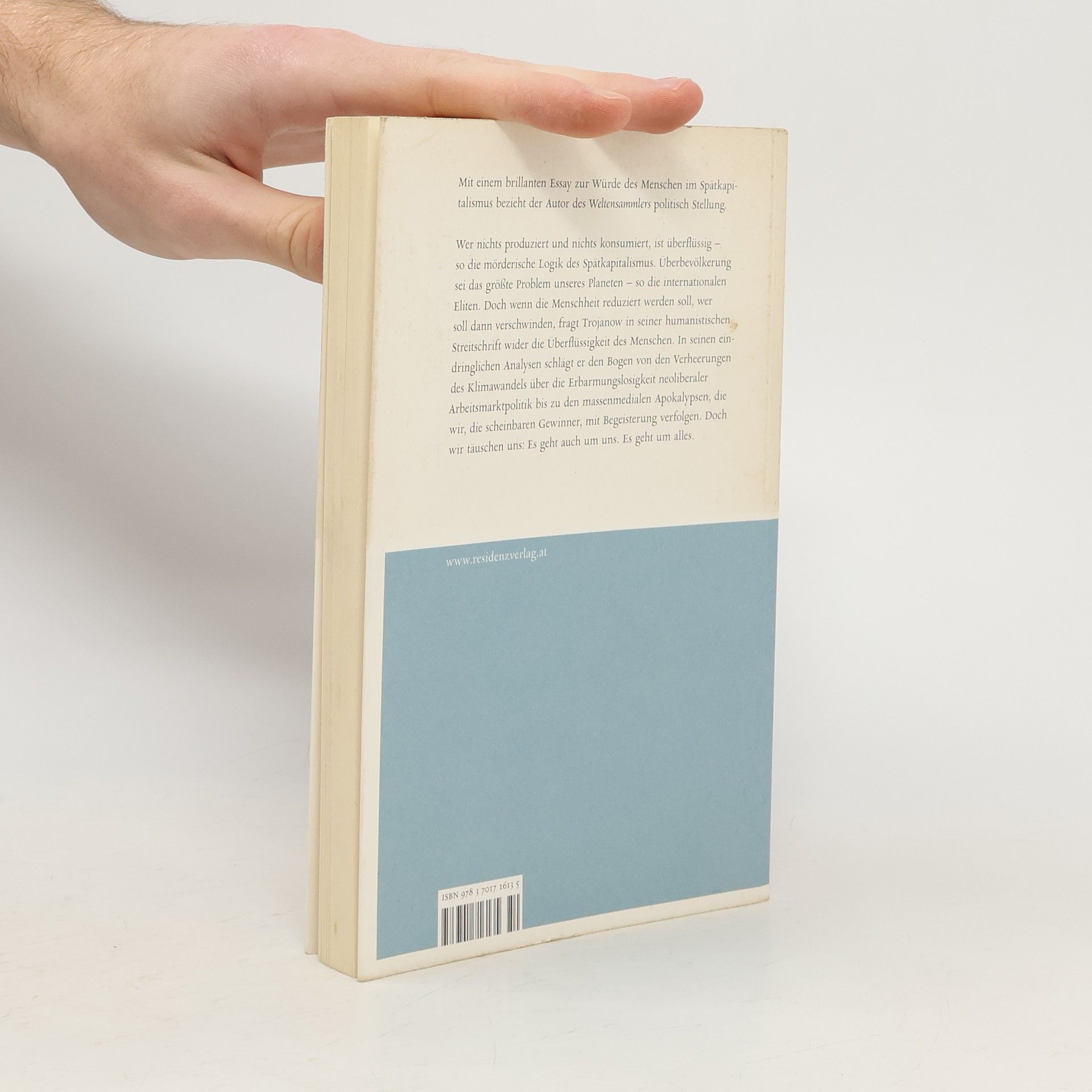 Ein Essay zur Würde des Menschen im Spätkapitalismus. Wer nichts produziert und nichts konsumiert, ist überflüssig – so die mörderische Logik des Spätkapitalismus. Überbevölkerung sei das größte Problem unseres Planeten – so die internationalen Eliten. Doch wenn die Menschheit reduziert werden soll, wer soll dann verschwinden, fragt Trojanow in seiner humanistischen Streitschrift wider die Überflüssigkeit des Menschen. In seinen eindringlichen Analysen schlägt er den Bogen von den Verheerungen des Klimawandels über die Erbarmungslosigkeit neoliberaler Arbeitsmarktpolitik bis zu den massenmedialen Apokalypsen, die wir, die scheinbaren Gewinner, mit Begeisterung verfolgen. Doch wir täuschen uns: Es geht auch um uns. Es geht um alles.