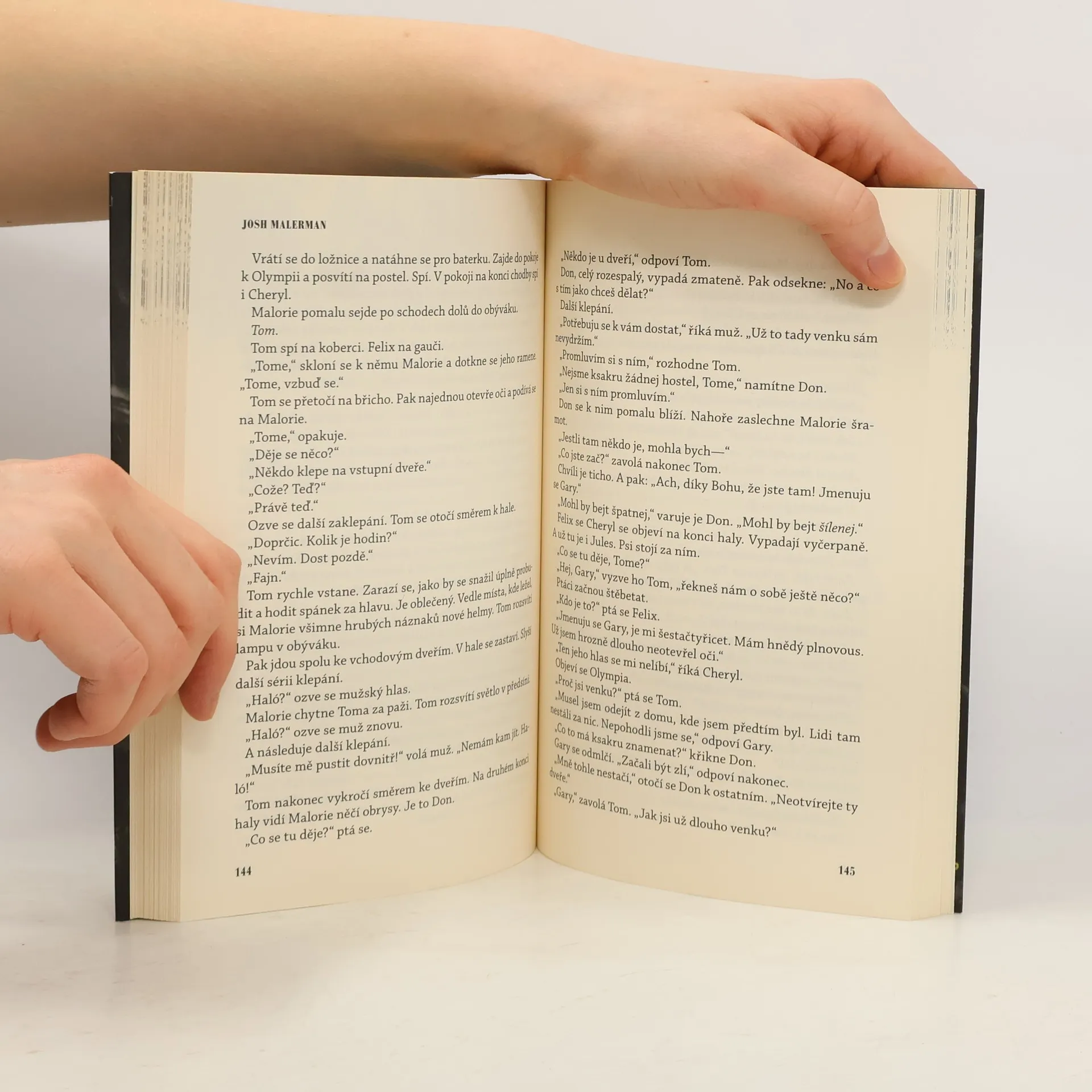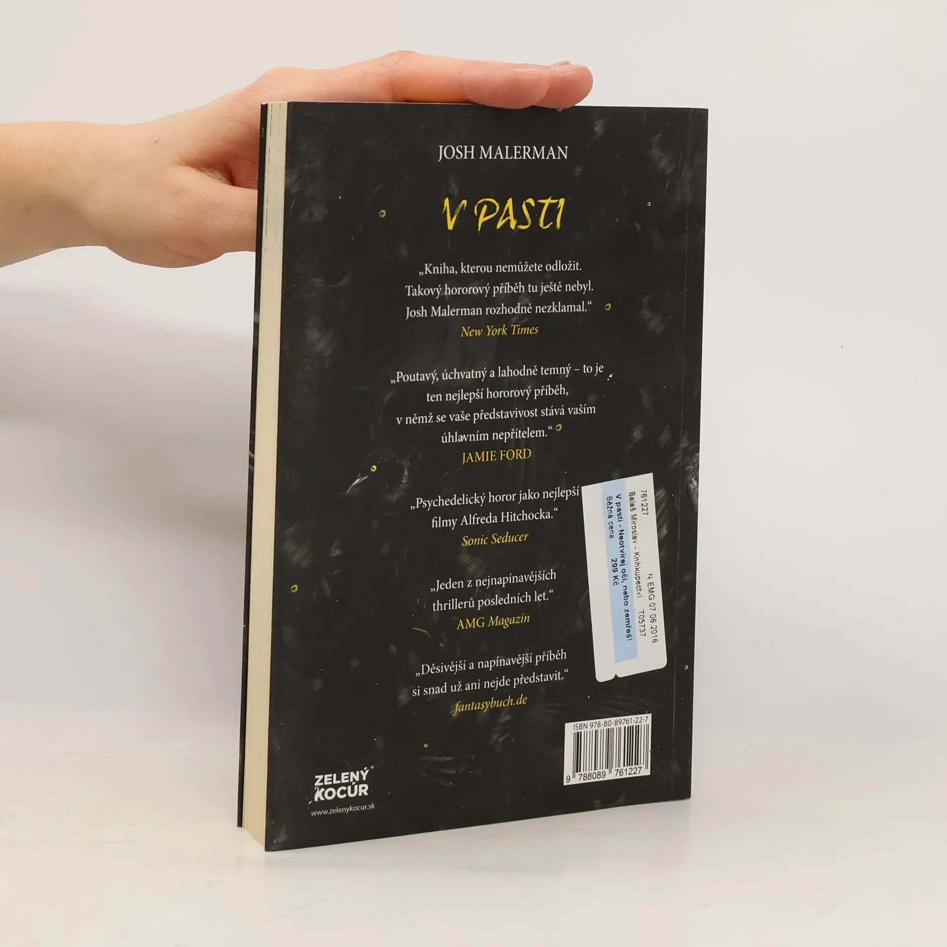 TAM VENKU NĚCO JE… Něco děsivého, co člověk nesmí spatřit. Stačí jediný pohled – a podlehneš smrtelnému násilí. Nikdo netuší, co to je ani odkud to přišlo. Pět let poté, co všechno začalo, zbývá už jen hrstka přeživších – včetně Malorie a jejích dvou malých dětí. Malorie žije v opuštěném domě poblíž řeky a už dlouho sní o tom, že uteče někam, kde snad bude s rodinou v bezpečí. Cesta, která ji čeká, je však hrozivá: překonat pětadvacet kilometrů po proudu řeky v malé loďce – poslepu. Stačí jedno špatné rozhodnutí a všichni zemřou. Něco je sleduje. Je to člověk, zvíře nebo stvůra? Ponořena do tmy, obklopena známými i neznámými zvuky, se Malorie vydává na svou hrůznou odyseu – na cestu, která ji zavede do nespatřeného světa i do minulosti, k přátelům, kteří jí kdysi zachránili život. Josh Malerman ve své úchvatné prvotině prolíná přítomnost s minulostí a nabízí čtenáři hrůzný, zároveň však nesmírně poutavý příběh zborceného světa, který budete hltat do poslední stránky.