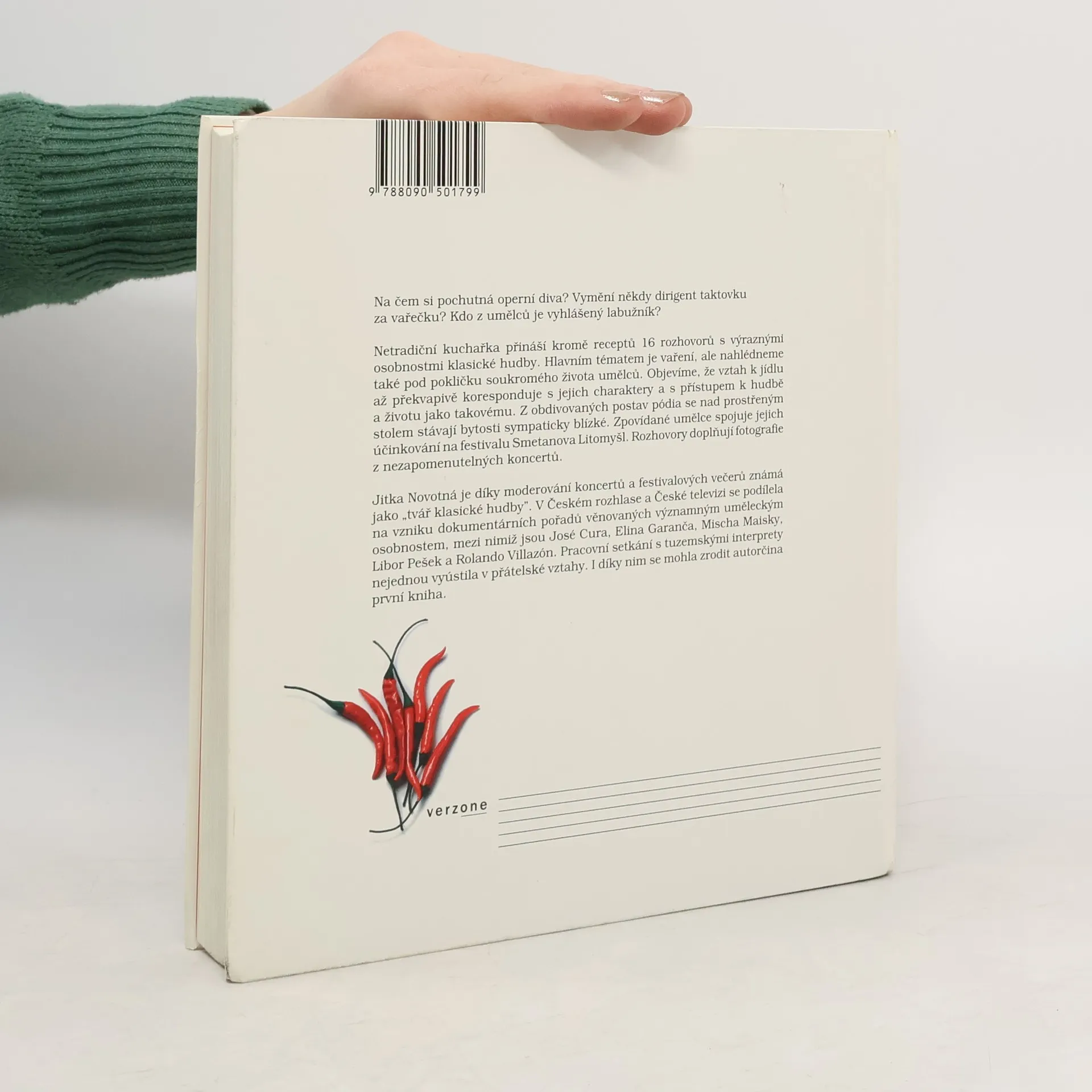 Radek Baborák, Jiří Bělohlávek, Kateřina Englichová, Marie Fajtová, Jitka Hosprová, Simona Houda Šaturová, Jakub Hrůša, Marko Ivanović, Roman Janál, Ondrej Lenárd, Štefan Margita, Dagmar Pecková, Libor Pešek, Leoš Svárovský, Magdalena Švecová, Ivan Ženatý o jídle a vaření. Na čem si pochutná operní diva? Vymění někdy dirigent taktovku za vařečku? Kdo z umělců je vyhlášený labužník? Netradiční kuchařka přináší kromě receptů 16 rozhovorů s výraznými osobnostmi klasické hudby. Hlavním tématem je vaření, ale nahlédneme také pod pokličku soukromého života umělců. Objevíme, že vztah k jídlu až překvapivě koresponduje s jejich charaktery a s přístupem k hudbě a životu jako takovému. Z obdivovaných postav pódia se nad prostřeným stolem stávají bytosti sympaticky blízké. Zpovídané umělce spojuje jejich účinkování na festivalu Smetanova Litomyšl. Rozhovory doplňují fotografie z nezapomenutelných koncertů. Jitka Novotná je díky moderování koncertů a festivalových večerů známá jako „tvář klasické hudby”. V Českém rozhlase a České televizi se podílela na vzniku dokumentárních pořadů věnovaných významným uměleckým osobnostem, mezi nimiž jsou José Cura, Elina Garanča, Mischa Maisky, Libor Pešek a Rolando Villazón. Pracovní setkání s tuzemskými interprety nejednou vyústila v přátelské vztahy. I díky nim se mohla zrodit autorčina první kniha. První vydání.