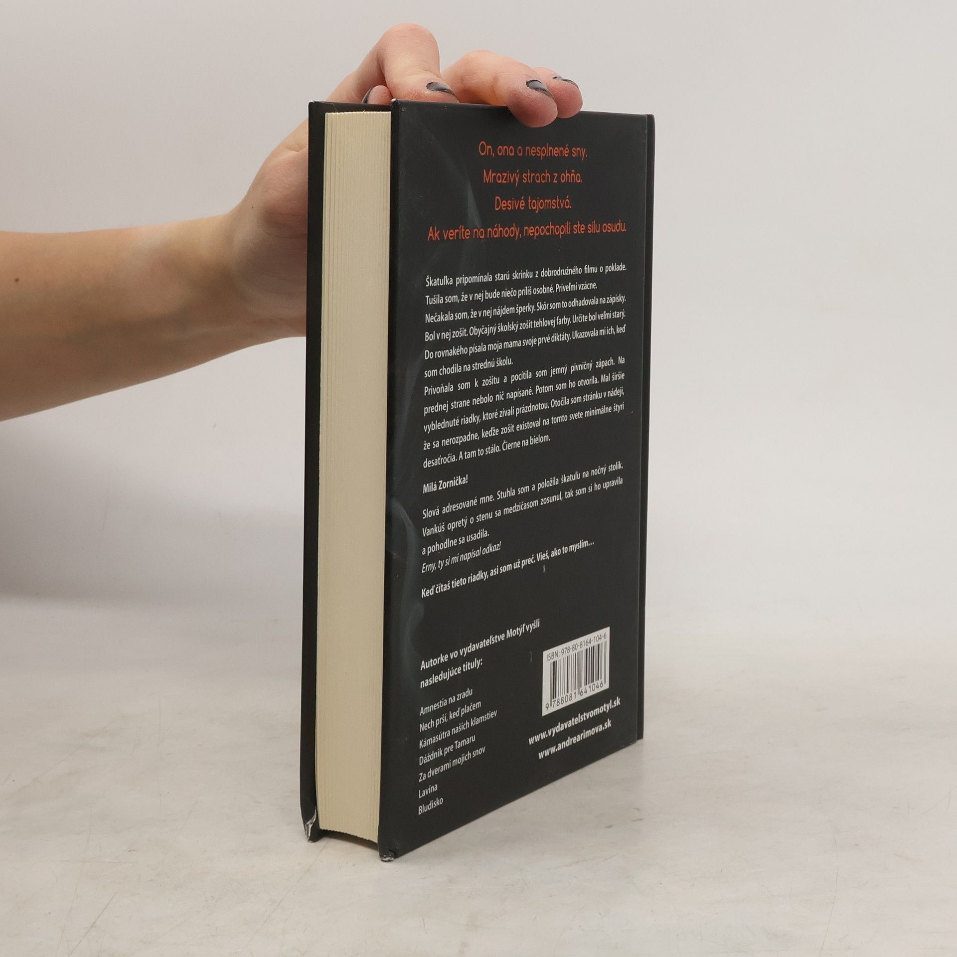 On, ona a nesplnené sny. Mrazivý strach z ohňa. Desivé tajomstvá. Ak veríte na náhody, nepochopili ste silu osudu. Škatuľka pripomínala starú skrinku z dobrodružného filmu o poklade. Tušila som, že v nej bude niečo príliš osobné. Priveľmi vzácne. Nečakala som, že v nej nájdem šperky. Skôr som to odhadovala na zápisky. Bol v nej zošit. Obyčajný školský zošit tehlovej farby. Určite bol veľmi starý. Do rovnakého písala moja mama svoje prvé diktáty. Ukazovala mi ich, keď som chodila na strednú školu. Privoňala som k zošitu a pocítila som jemný pivničný zápach. Na prednej strane nebolo nič napísané. Potom som ho otvorila. Mal širšie vyblednuté riadky, ktoré zívali prázdnotou. Otočila som stránku v nádeji, že sa nerozpadne, keďže zošit existoval na tomto svete minimálne štyri desaťročia. A tam to stálo. Čierne na bielom. Milá Zornička! Slová adresované mne. Stuhla som a položila škatuľu na nočný stolík. Vankúš opretý o stenu sa medzičasom zosunul, tak som si ho upravila a pohodlne sa usadila. Erny, ty si mi napísal odkaz! Keď čítaš tieto riadky, asi som už preč. Vieš, ako to myslím…