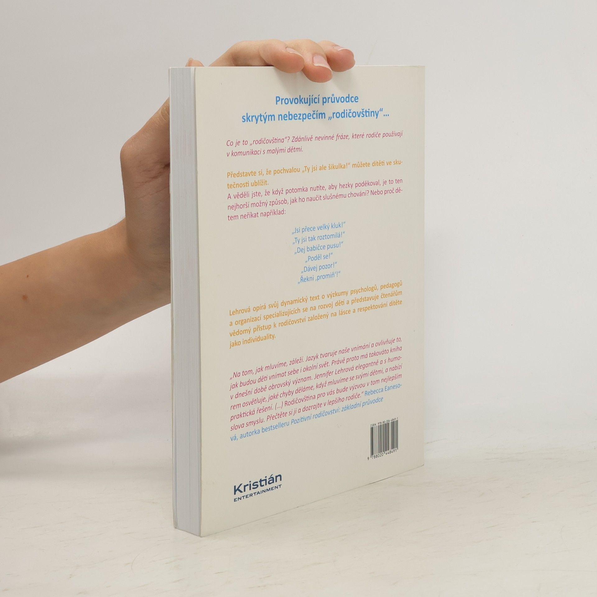 Co je to ,,rodičovština"? Zdánlivě nevinné fráze, které rodiče používají v komunikaci s malými dětmi. Představte si, že pochvalou ,,To se ti moc povedlo"! můžete dítěti ve skutečnosti ublížit. A věděli jste, že když potomka nutíte, aby hezky poděkoval, je to ten nejhorší možný způsob, jak ho naučit slušnému chování? Jennifer Lehrová je chytrá, vtipná a nebojácná autorka, která ,,převrátí vzhůru nohama všechny vaše zažité představy o rodičovství." ( Jennifer Jason Leighová). Lehrová opírá svůj dynamický text o výzkumy psychologů, pedagogů a organizací specializujících se na rozvoj dětí a představuje čtenářům vědomý přístup k rodičovství založený na lásce a respektování dítěte jako individuality.