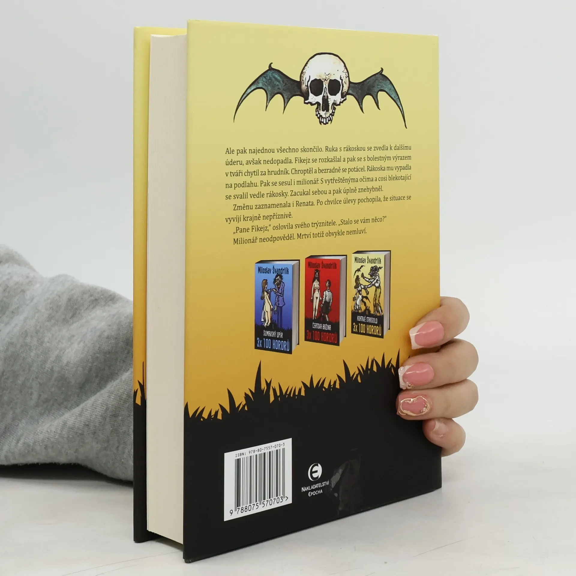 3 x 100 hororů - kniha III. Projekt 3 x 100 hororů přináší čtenářům ve třech svazcích kompletní soubor všech povídek, které na téma hrůzy, mystiky, záhrobí a nevysvětlitelných záhad napsal Miloslav Švandrlík. Autorův vynalézavý způsob, jak čtenáře vyděsit či alespoň postrašit, a přitom ho vtipně pobavit, si konzumenti příběhů o upírech, krvelačných monstrech nebo vlkodlacích oblíbili už dávno. Důkazem je mimo jiné i umístění výběru „100 nejlepších hororů“ v první desítce knih, které si mládež zapsala do čtenářských deníků žáků 9. tříd základních škol.