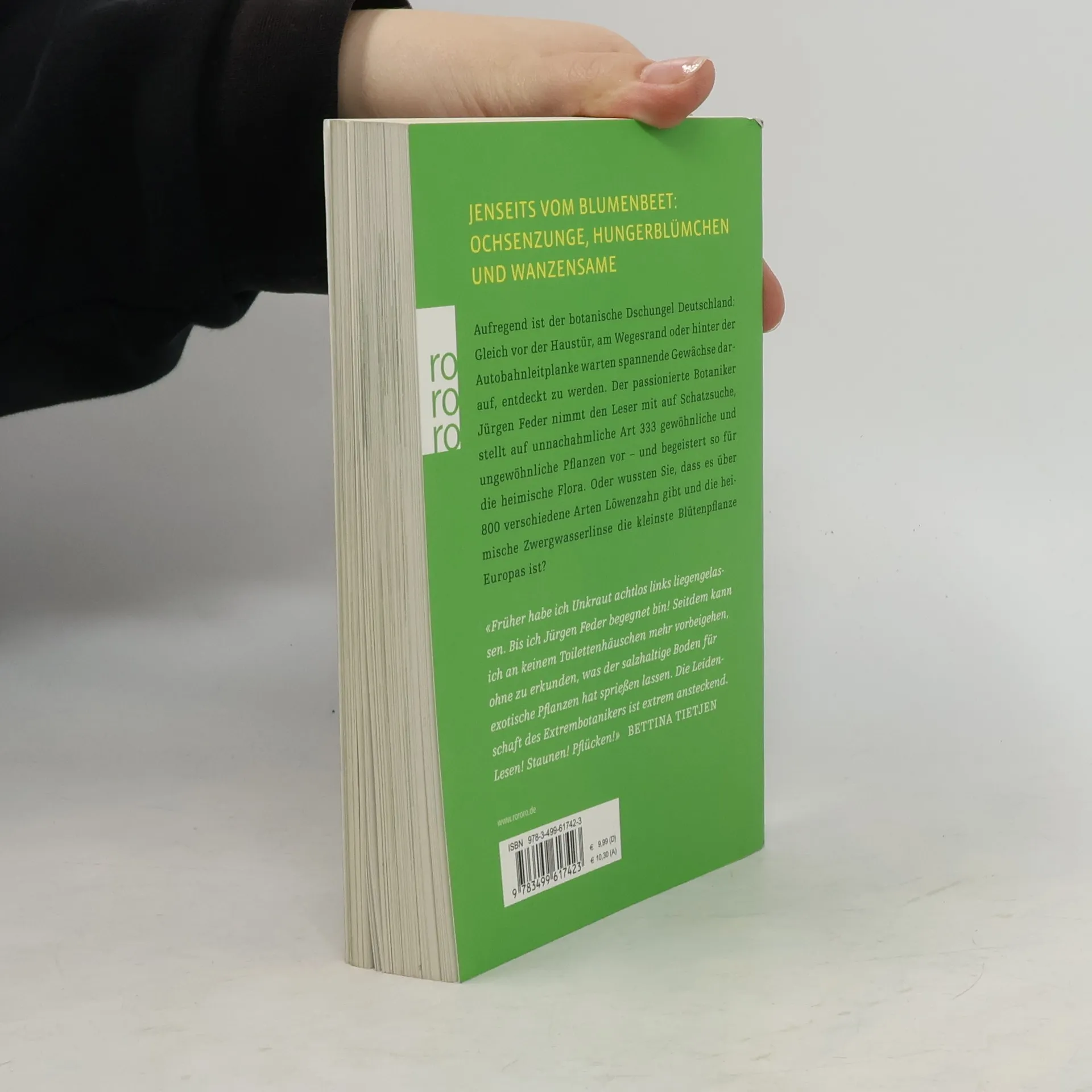 Aufregend ist der botanische Dschungel Deutschland: Gleich vor der Haustür, am Wegesrand oder hinter der Autobahnleitplanke warten spannende Gewächse darauf, entdeckt zu werden. Der passionierte Botaniker Jürgen Feder nimmt den Leser mit auf Schatzsuche, stellt auf unnachahmliche Art 333 gewöhnliche und ungewöhnliche Pflanzen vor – und begeistert so für die heimische Flora. Oder wussten Sie, dass es über 800 verschiedene Arten Löwenzahn gibt und die heimische Zwerg-Wasserlinse die kleinste Blütenpflanze Europas ist? «Autobahnen sind wahre ‹Pflanzensamenverbreitungsmaschinen›. Durch das jahrzehntelange Streuen von Tausalzen wurden sie zu Wanderstrecken für viele salzliebende Pflanzen, darunter das Dänische Löffelkraut (Cochlearia danica) oder der Krähenfuß-Wegerich (Plantago coronopus), die früher nur an der Küste gedeihten.» (Jürgen Feder) «An den ungewöhnlichsten Orten kann man überraschende Funde machen, wie die Fuchsrote Borstenhirse (Setaria purrila) – entdeckt direkt vor einem Toilettenhäuschen an der A 27. Warum? Weil sich dort bevorzugt Nährstoffe und Salze von menschlichem Urin sammeln, die sie liebt.» (Jürgen Feder) «Ein Samenspender par excellence ist das Schmalblättrige Weidenröschen (Epilobium angustifolium), einmal geschüttelt und schon sind Tausende Samen verteilt. Eine absolute Rakete - schlank wie ein Spargel, aber glatt zwei Meter hoch.» (Jürgen Feder)