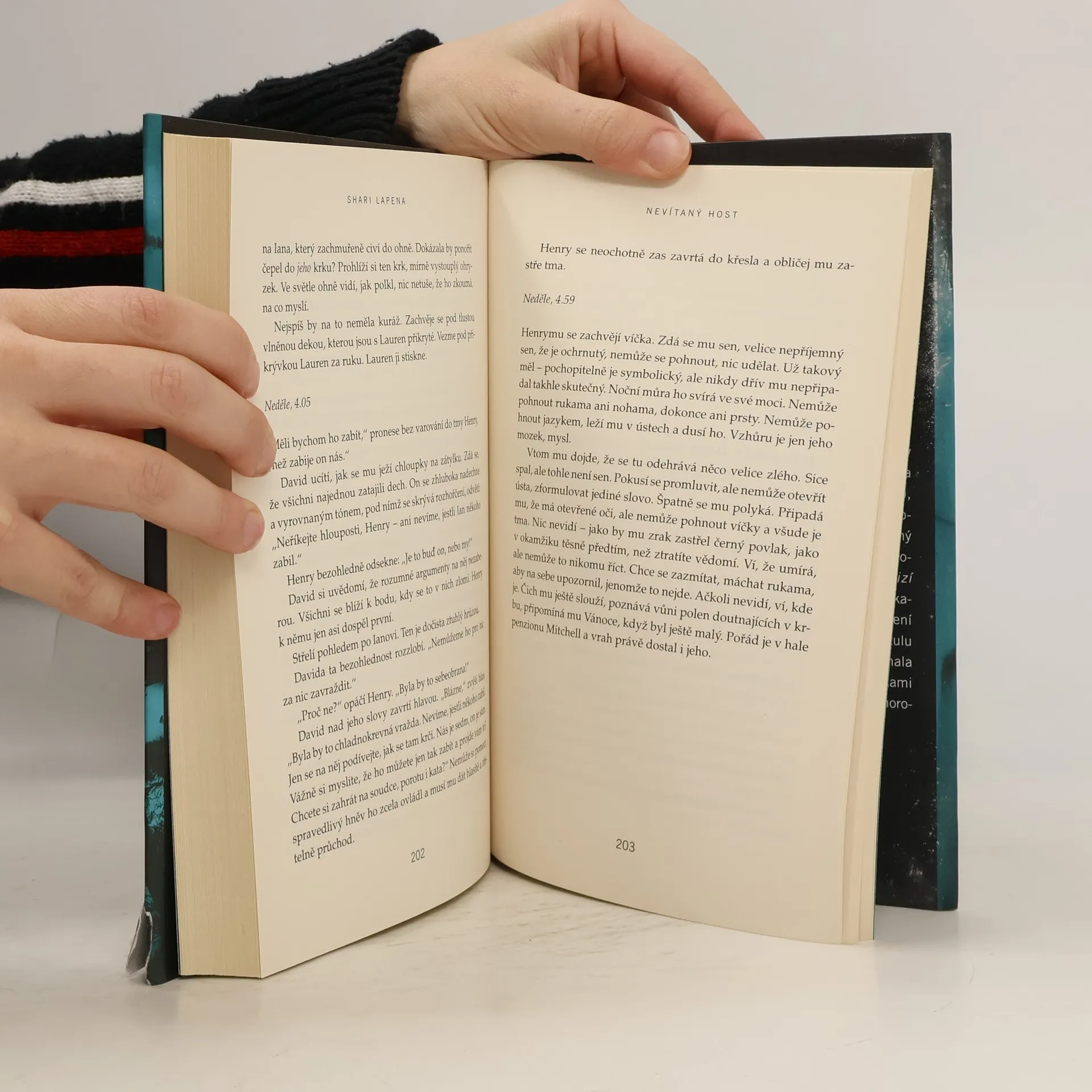 Do odlehlého venkovského hotelu přijíždí na zimní víkend několik hostů: Gwen a její kamarádka Riley, páry Ian a Lauren, Matthew a Dana, Beverly a Henry, proslulý obhájce David a staropanenská spisovatelka Candice. Poté co dorazí, udeří sněhová bouře, která odstřihne hotel od elektřiny i veškerého kontaktu s vnějším světem. A hned první noc dojde k tragické nehodě: Dana spadne ze schodů a zabije se. Byl to ale nezaviněný pád? Atmosféra houstne, baterie mobilů se pomalu vybíjejí a nedůvěra mezi hosty přechází v paranoiu – další smrt na sebe totiž nenechá dlouho čekat, a tentokrát už je to nepochybně vražda... Inspirace klasickými detektivkami, plíživé sílící napětí a hororové vyústění – Shari Lapena ani tentokrát neušetří čtenáře šokujícího odhalení, stejně nečekaného, jaký přinesly závěrečné zvraty v jejích předchozích psychothrillerech Manželé odvedle a Někdo cizí v domě