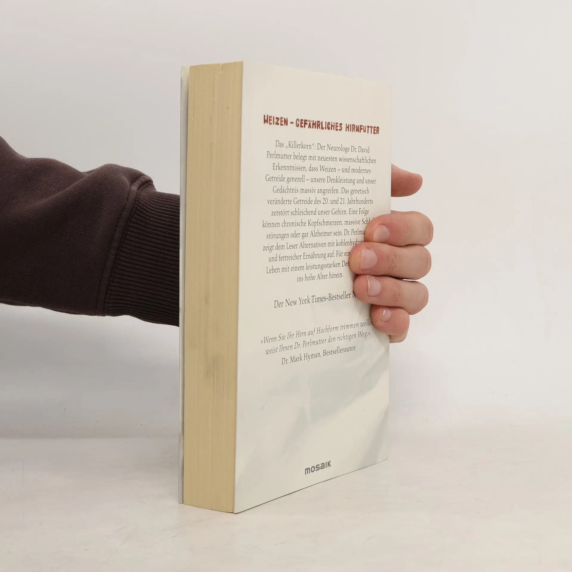 Achtung Weizen - gefährliches Hirnfutter! Weizen, das „Killerkorn“: Der Neurologe Dr. David Perlmutter belegt mit neuesten wissenschaftlichen Erkenntnissen, dass Weizen unsere Gesundheit, speziell unsere Denkleistung und unser Gedächtnis, massiv angreift. Das genetisch veränderte Getreide des 20. und 21. Jahrhunderts zerstört schleichend unser Gehirn. Eine Folge können chronische Kopfschmerzen, massive Schlafstörungen, Demenz oder sogar Alzheimer sein. Dr. Perlmutter zeigt dem Leser Alternativen mit kohlenhydratarmer und fettreicher Ernährung auf. Für ein gesundes Leben mit einem leistungsstarken Denkorgan bis ins hohe Alter hinein.