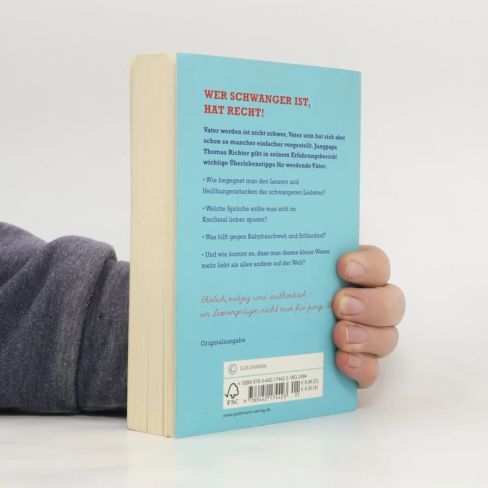 Jungpapa Thomas Richter gibt in seinem Erfahrungsbericht wichtige Überlebenstipps für werdende Väter: Wie begegnet man den Launen und Heißhungerattacken der schwangeren Liebsten? Warum ist sein Bauch fast dicker als ihrer? Welche Sprüche sollte man sich im Kreißsaal lieber sparen? Was hilft gegen Babybauchweh und Schluckauf? Und wie kommt es, dass man dieses kleine Wesen mehr liebt als alles andere auf der Welt? Ehrlich, witzig und authentisch – ein Lesevergnügen nicht nur für junge Eltern!