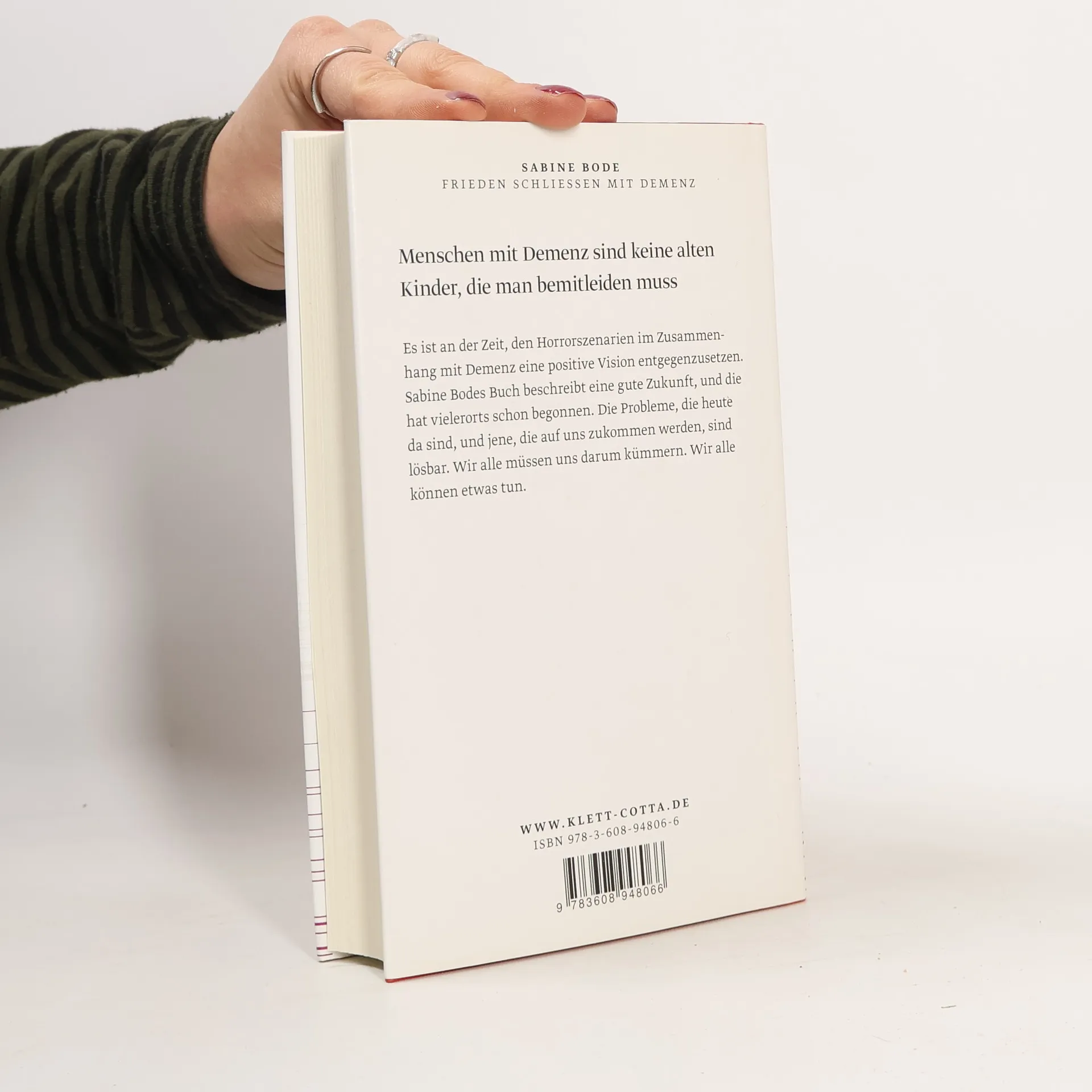Es ist an der Zeit, den Horrorszenarien im Zusammenhang mit Demenz eine positive Vision entgegenzusetzen. Sabine Bodes Buch beschreibt eine gute Zukunft. Denn die Probleme, die heute da sind, und jene, die auf uns zukommen werden, sind lösbar. Welche Optionen bleiben? Weiter weggucken? Darauf warten, dass das rettende Medikament gefunden wird? Oder unser Schicksal in die Hand nehmen, unsere Zukunft gestalten. Sabine Bode besuchte Alten und Pflegeheime, sprach mit Pflegepersonal, Wissenschaftlern und porträtiert Helfer, die unermüdlich Demenzerkrankten helfen, in Würde zu altern. Sie vollführt einen Perspektivwechsel: Sie bringt festgefahrene Ängste zum Einsturz und zeigt unzählige gute Ansätze und Mut machende Erfahrungen. Dieses Buch ist ein Plädoyer für ein Umdenken.