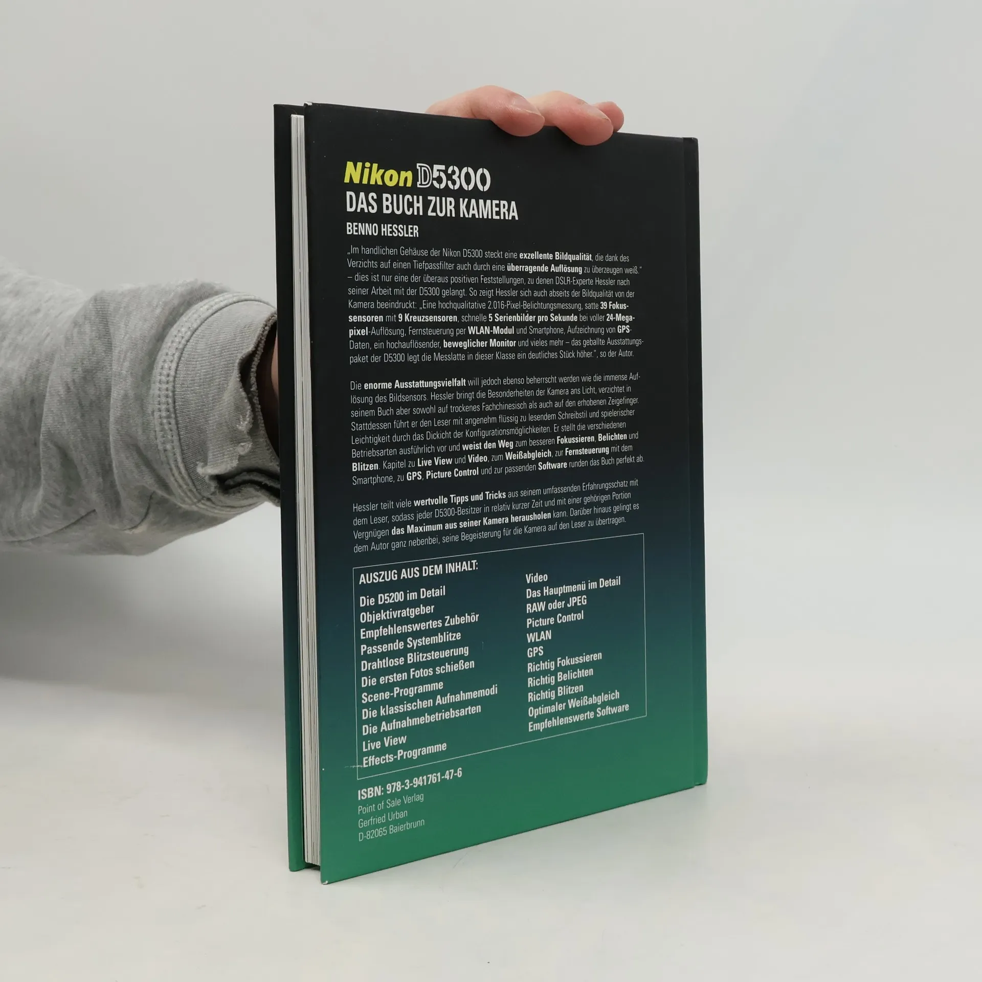 „Im handlichen Gehäuse der Nikon D5300 steckt eine exzellente Bildqualität, die dank des Verzichts auf einen Tiefpassfilter auch durch eine überragende Auflösung zu überzeugen weiß.“ – dies ist nur eine der positiven Feststellungen, zu denen DSLR-Experte Hessler nach seiner Arbeit mit der D5300 gelangt. Er zeigt sich beeindruckt von der Kamera: „Eine hochqualitative 2.016-Pixel-Belichtungsmessung, satte 39 Fokussensoren mit 9 Kreuzsensoren, schnelle 5 Serienbilder pro Sekunde bei voller 24-Megapixel-Auflösung, Fernsteuerung per WLAN-Modul und Smartphone, Aufzeichnung von GPS-Daten, ein hochauflösender, beweglicher Monitor und vieles mehr – das geballte Ausstattungspaket der D5300 legt die Messlatte in dieser Klasse ein deutliches Stück höher.“ Hessler beleuchtet die Besonderheiten der Kamera ohne trockenes Fachchinesisch oder erhobenen Zeigefinger. Mit einem flüssig lesbaren Schreibstil führt er den Leser durch die Konfigurationsmöglichkeiten, stellt verschiedene Betriebsarten vor und gibt Hinweise zum besseren Fokussieren, Belichten und Blitzen. Kapitel zu Live View, Video, Weißabgleich, Fernsteuerung mit dem Smartphone, GPS, Picture Control und Software runden das Buch ab. Hessler teilt wertvolle Tipps aus seinem Erfahrungsschatz, sodass jeder D5300-Besitzer schnell und mit Vergnügen das Maximum aus seiner Kamera herausholen kann und seine Begeisterung für die Kamera auf den Leser überträgt.