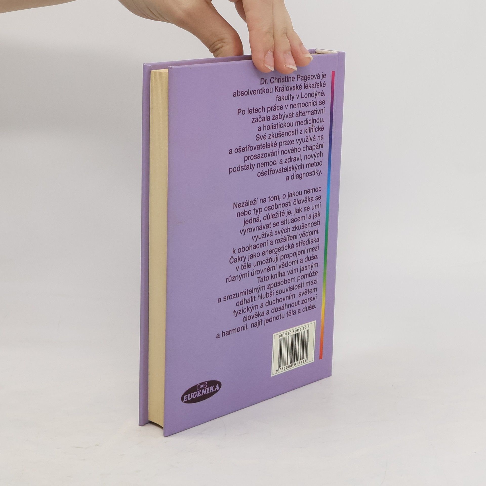 Kniha vám jasným a srozumitelným způsobem pomůže odhalit hlubší souvislosti mezi fyzickým a duchovním světem člověka a dosáhnout zdraví a harmonii, najít jednotu těla a duše. Čakry jako energetická střediska v těle umožňují propojení mezi různými úrovněmi vědomí a duše. Kniha odhaluje hlubší souvislost mezi fyzickým a duchovním světem člověka k dosažení zdraví a harmonie. Autorka je absolventkou Královské lékařské fakulty v Londýně. Po letech práce v nemocnici se začala zabývat alternativní a holistickou medicínou. Své zkušenosti z klinické a ošetřovatelské praxe využívá na prosazování nového chápání podstaty nemoci a zdraví, nových ošetřovatelských metod a diagnostiky.