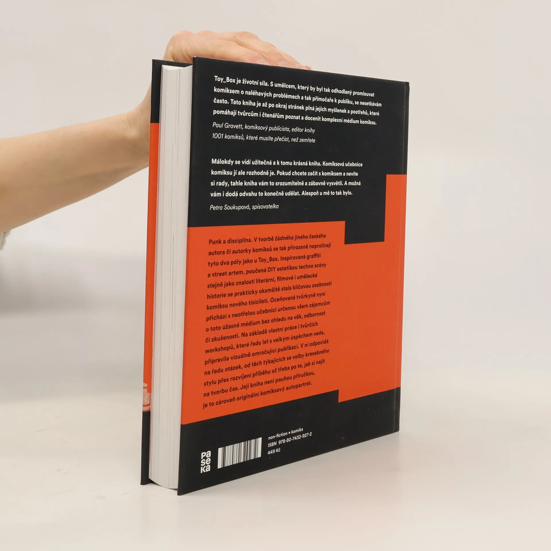 Punk a disciplína. V tvorbě žádného jiného českého autora či autorky komiksů se tak přirozeně neprolínají tyto dva póly jako u Toy_Box. Inspirovaná graffiti a street artem, poučená DIY estetikou techno scény stjně jako znalostí literární, filmové i umělecké historie, se prakticky okamžitě stala klíčovou osobností komiksu nového tisíciletí. Oceňovaná tvůrkyně nyní přichází s neotřelou učebnicí určenou všem zájemcům o toto úžasné médium bez ohledu na věk, odbornost či zkušenosti. Na základě vlastní práce i tvůrčích workshopů, které řadu let s velkým úspěchem vede, připravila vizuálně omračující publikaci. V ní odpovídá na řadu otázek, od těch týkajících se volby kresebného stylu přes rozvíjení příběhu až třeba po to, jak si najít na tvorbu čas. Její kniha není pouhou příručkou, je zároveň originální komiksový autoportrét.
