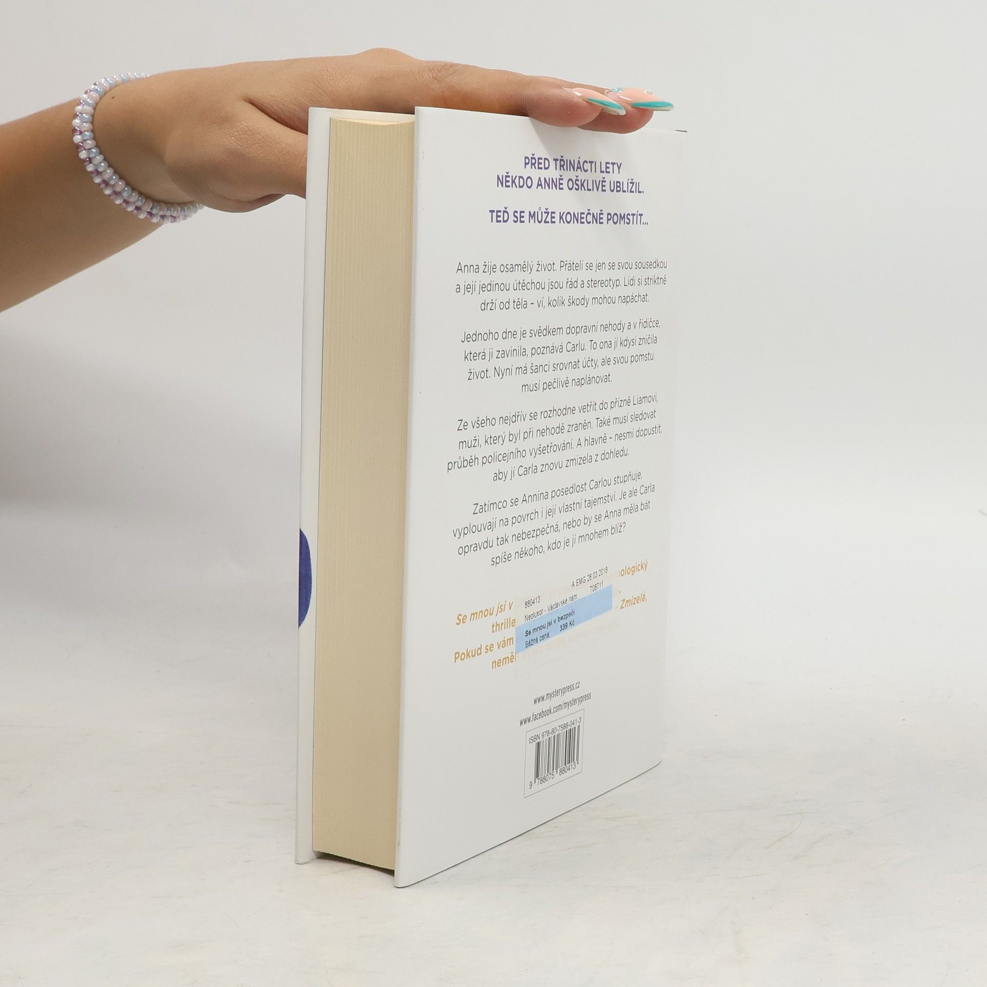 PŘED TŘINÁCTI LETY NĚKDO ANNĚ OŠKLIVĚ UBLÍŽIL. TEĎ SE MŮŽE KONEČNĚ POMSTÍT… Anna žije osamělý život. Přátelí se jen se svou sousedkou a její jedinou útěchou jsou řád a stereotyp. Lidi si striktně drží od těla – ví, kolik škody mohou napáchat. Jednoho dne je svědkem dopravní nehody a v řidičce, která ji zavinila, poznává Carlu. To ona jí kdysi zničila život. Nyní má šanci srovnat účty, ale svou pomstu musí pečlivě naplánovat. Ze všeho nejdřív se rozhodne vetřít do přízně Liamovi, muži, který byl při nehodě zraněn. Také musí sledovat průběh policejního vyšetřování. A hlavně – nesmí dopustit, aby jí Carla znovu zmizela z dohledu. Zatímco se Annina posedlost Carlou stupňuje, vyplouvají na povrch i její vlastní tajemství. Je ale Carla opravdu tak nebezpečná, nebo by se Anna měla bát spíše někoho, kdo je jí mnohem blíž? Se mnou jsi v bezpečí je podmanivý psychologický thriller, který vás chytne a nepustí. Pokud se vám líbily knihy Dívka ve vlaku a Zmizelá, neměli byste tento román minout.