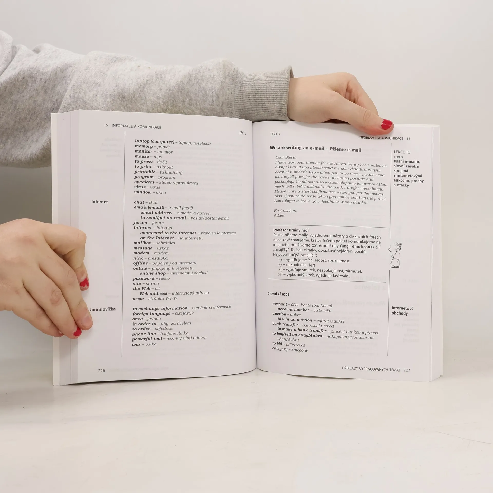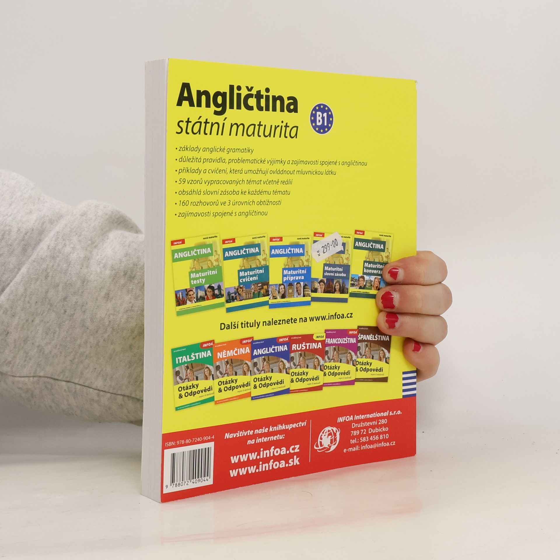 Kniha obsahuje základy anglické gramatiky, důležitá pravidla, problematické výjimky a zajímavosti spojené s angličtinou, příklady a cvičení, která umožňují ovládnout mluvnickou látku. Dále 59 vzorů vypracovaných témat včetně reálií, obsáhlou slovní zásobu ke každému tématu, 160 rozhovorů ve 3 úrovních obtížnosti. Nahrávka k dispozici na www.infoa.cz.