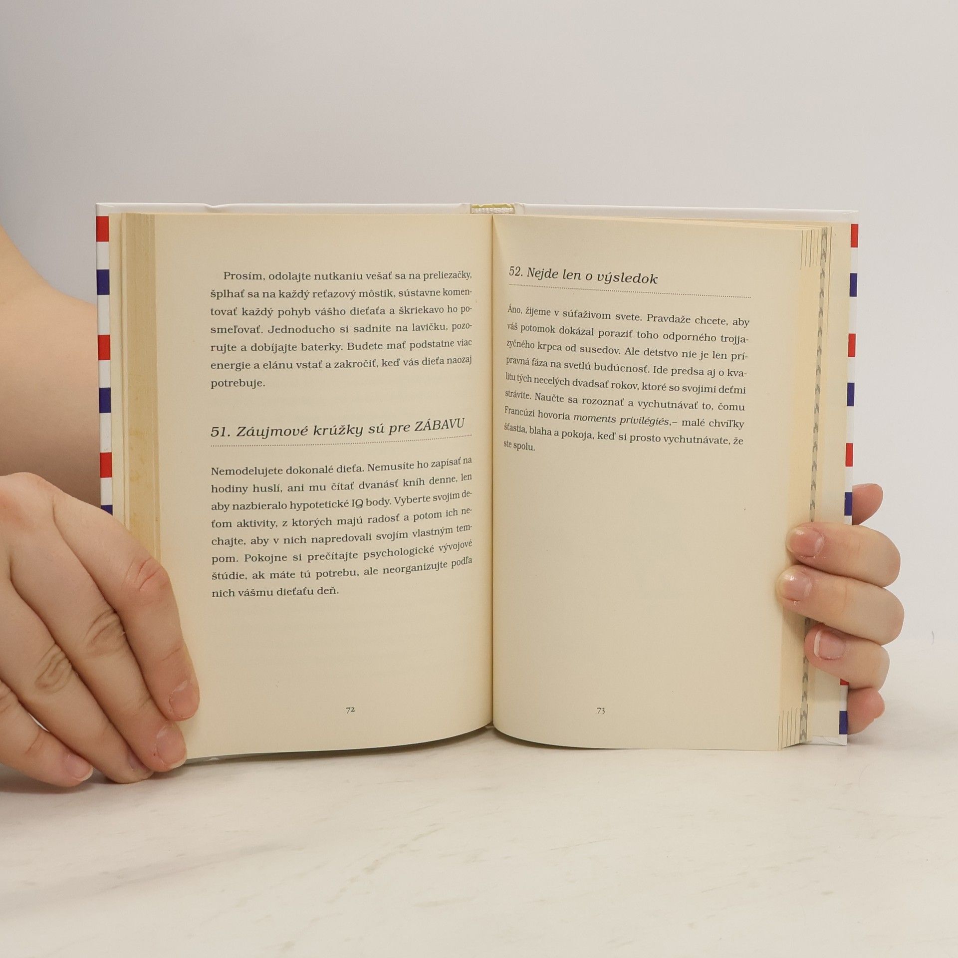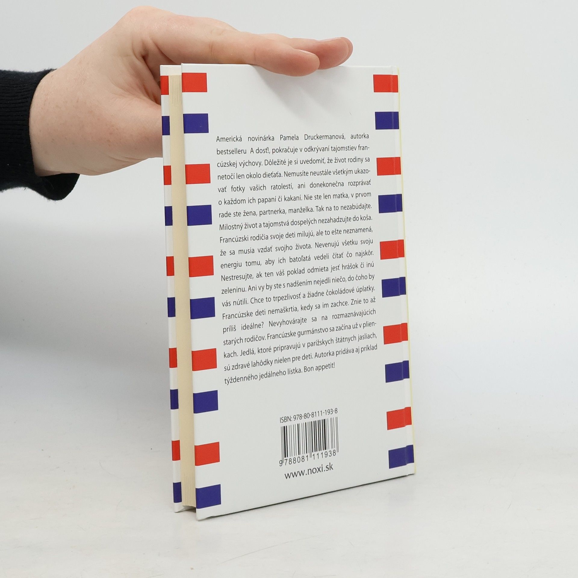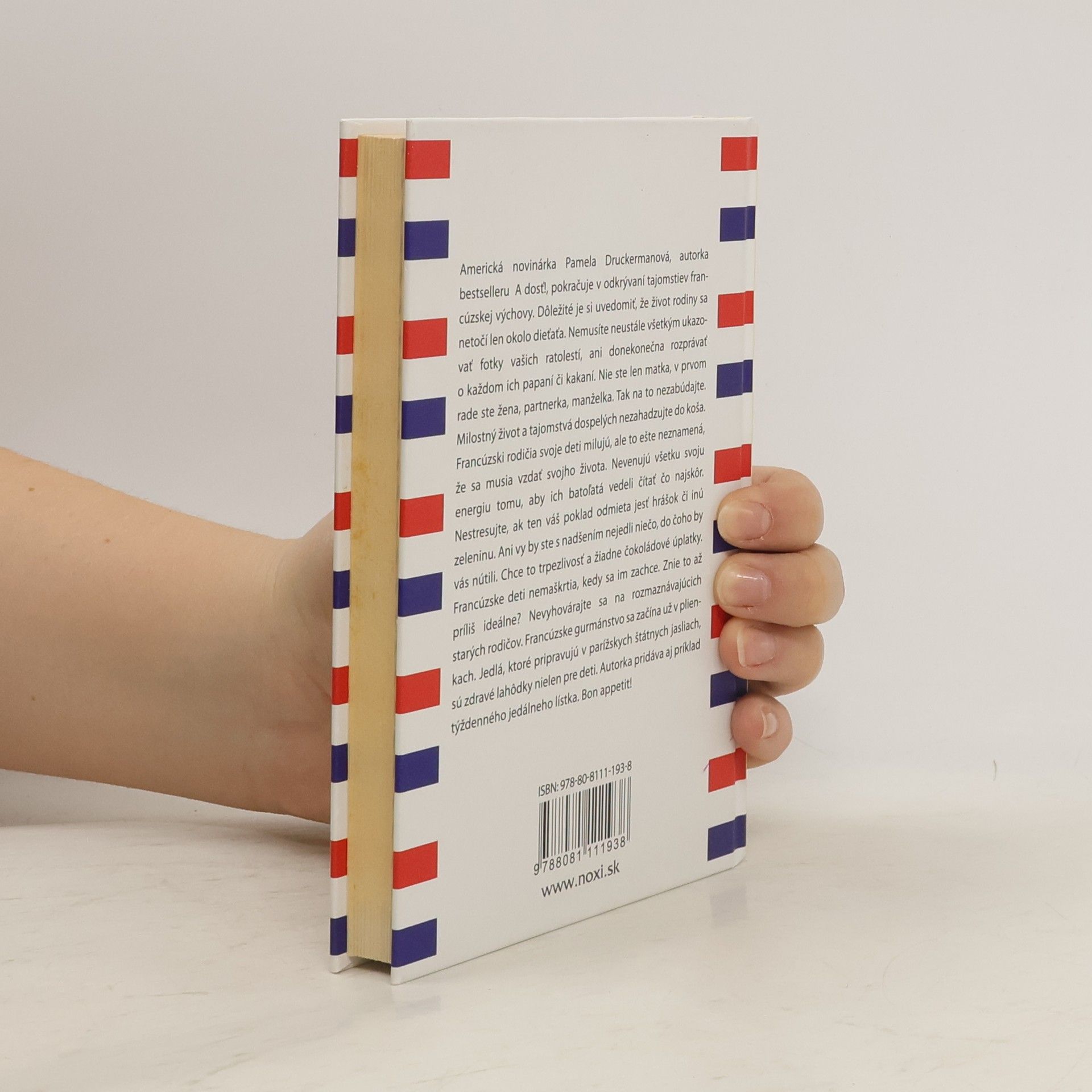Americká novinárka Pamela Druckerman a autorka bestselleru A dosť! pokračuje v odkrývaní tajomstiev francúzskej výchovy. Dôležité je si uvedomiť, že život rodiny sa netočí len okolo dieťaťa. Nemusíte neustále všetkým ukazovať fotky vašich ratolestí, ani donekonečna rozprávať o každom ich papaní či kakaní. Nie ste len matka, v prvom rade ste žena, partnerka, manželka. Tak na to nezabúdajte. Milostný život a tajomstvá dospelých nezahadzujte do koša. Francúzski rodičia svoje deti milujú, ale to ešte neznamená, že sa musia vzdať svojho života. Nevenujú všetku svoju energiu tomu, aby ich batoľatá vedeli čítať čo najskôr. Nestresujte, ak ten váš poklad odmieta jesť hrášok či inú zeleninu. Ani vy by ste s nadšením nejedli niečo, do čoho by vás nútili. Chce to trpezlivosť a žiadne čokoládové úplatky. Francúzske deti nemaškrtia, kedy sa im zachce. Znie to až príliš ideálne? Nevyhovárajte sa na rozmaznávajúcich starých rodičov. Francúzske gurmánstvo sa začína už v plienkach. Jedlá, ktoré pripravujú v parížskych štátnych jasliach, sú zdravé lahôdky nielen pre deti. Autorka pridáva aj príklad týždenného jedálneho lístka. Bon appetit!