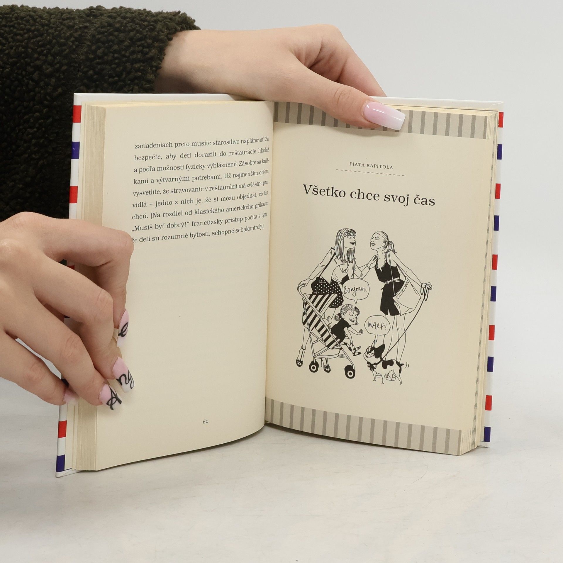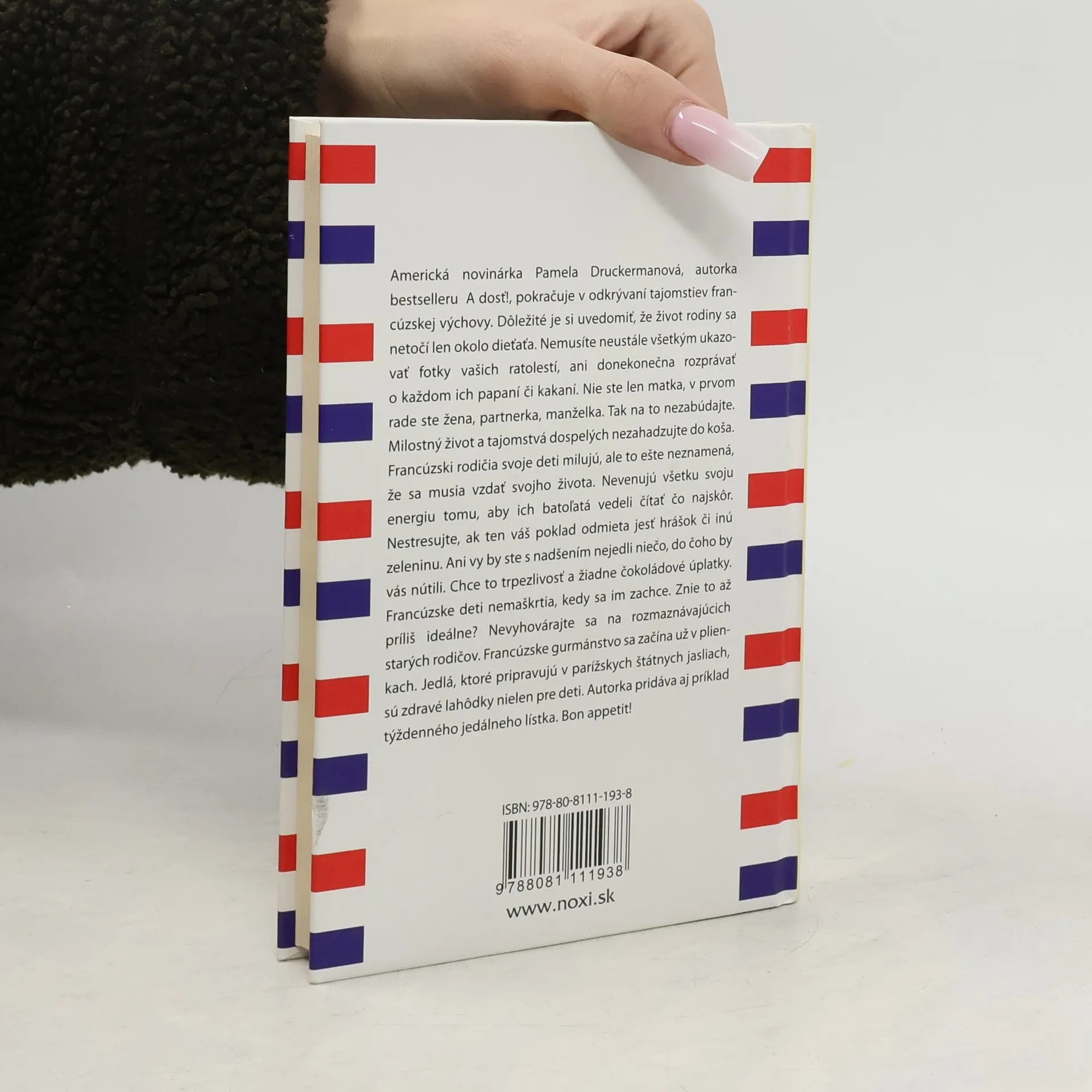 Americká novinárka Pamela Druckerman a autorka bestselleru A dosť! pokračuje v odkrývaní tajomstiev francúzskej výchovy. Dôležité je si uvedomiť, že život rodiny sa netočí len okolo dieťaťa. Nemusíte neustále všetkým ukazovať fotky vašich ratolestí, ani donekonečna rozprávať o každom ich papaní či kakaní. Nie ste len matka, v prvom rade ste žena, partnerka, manželka. Tak na to nezabúdajte. Milostný život a tajomstvá dospelých nezahadzujte do koša. Francúzski rodičia svoje deti milujú, ale to ešte neznamená, že sa musia vzdať svojho života. Nevenujú všetku svoju energiu tomu, aby ich batoľatá vedeli čítať čo najskôr. Nestresujte, ak ten váš poklad odmieta jesť hrášok či inú zeleninu. Ani vy by ste s nadšením nejedli niečo, do čoho by vás nútili. Chce to trpezlivosť a žiadne čokoládové úplatky. Francúzske deti nemaškrtia, kedy sa im zachce. Znie to až príliš ideálne? Nevyhovárajte sa na rozmaznávajúcich starých rodičov. Francúzske gurmánstvo sa začína už v plienkach. Jedlá, ktoré pripravujú v parížskych štátnych jasliach, sú zdravé lahôdky nielen pre deti. Autorka pridáva aj príklad týždenného jedálneho lístka. Bon appetit!