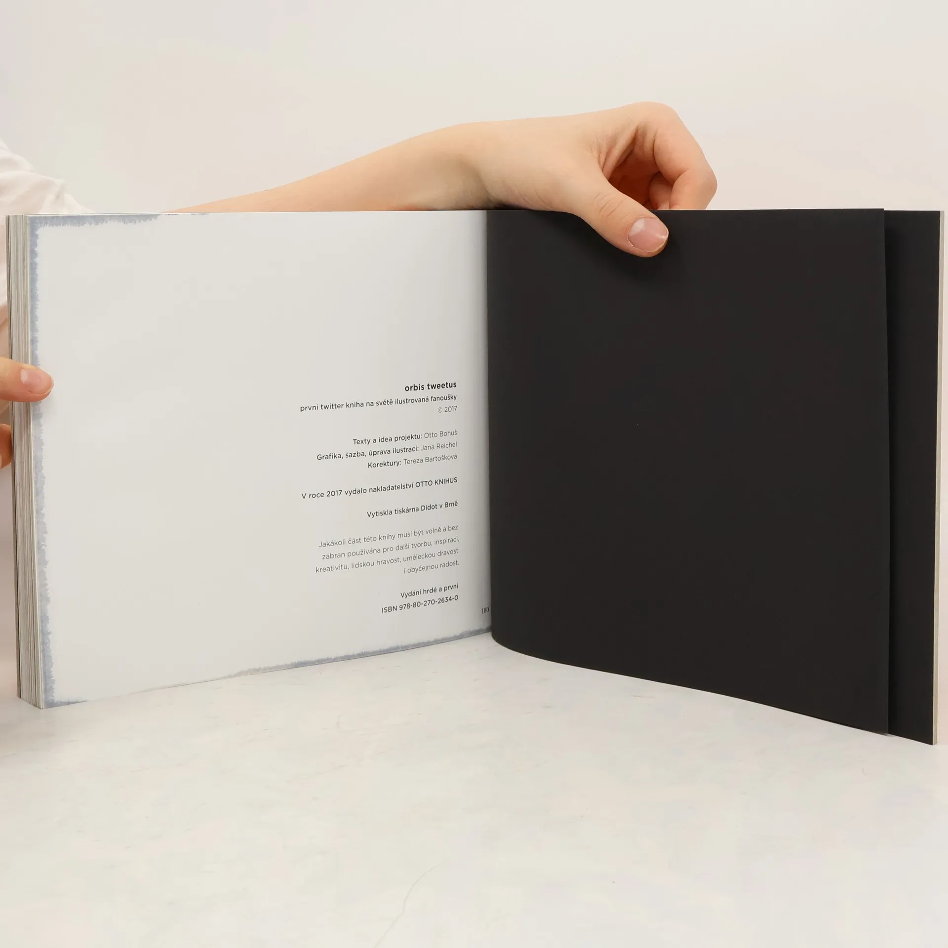 Unikátní knižní projekt, který nemá obdobu v ČR, ani v zahraničí – první Twitter kniha na světě ilustrovaná fanoušky. A možná jde i o první fyzický důkaz komunitní literatury, která vznikla ze sociálních sítí. Orbis Tweetus je ilustrovaná kniha složená z tweetů o tom, jak psát marketingové texty. Tyto krátké rady od profesionálního textaře Otto Bohuše ilustrovali přímo jeho fanoušci – kteří pak náročný tisk knihy podpořili v crowdfundingové kampani částkou přes 200 000 Kč. Orbis Tweetus je textový svět 140 znaků ve 104 obrazech. Typograficky naprosto precizní kniha si hraje s jazykem a prozrazuje triky reklamních textařů – ve formě kratší než je rozsah jedné SMS. Knihu berte do ruky jen na vlastní nebezpečí: reálně hrozí, že vás nakazí spontánní energií k vlastní tvorbě. A psaní vás začne i bavit. Více informací najdete na www.orbis-tweetus.cz