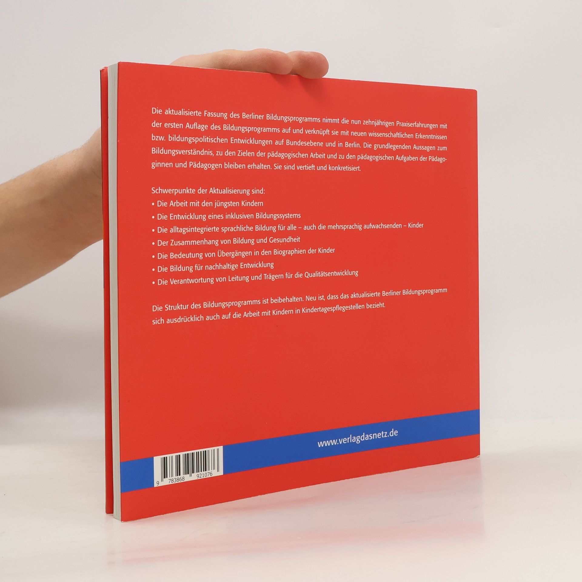 Alle Kinder haben ein Recht auf Bildung – von Anfang an. Das aktualisierte Berliner Bildungsprogramm legt dar, welche grundlegenden Kenntnisse und Fähigkeiten Kinder in ihren ersten sechs Lebensjahren benötigen, um ihren Lebensweg erfolgreich zu gestalten. Es bietet einen wissenschaftlich fundierten Orientierungsrahmen für alle Berliner Kindertageseinrichtungen und hat auch bundesweit sowie international große Zustimmung gefunden. Die neue Fassung integriert zehn Jahre Praxiserfahrungen mit der ersten Auflage und verknüpft diese mit aktuellen wissenschaftlichen Erkenntnissen sowie bildungspolitischen Entwicklungen. Die grundlegenden Aussagen zum Bildungsverständnis, den Zielen der pädagogischen Arbeit und den Aufgaben der Pädagoginnen und Pädagogen bleiben bestehen, werden jedoch vertieft und konkretisiert. Schwerpunkte der Aktualisierung sind die Arbeit mit den jüngsten Kindern, die Entwicklung eines inklusiven Bildungssystems, alltagsintegrierte sprachliche Bildung für mehrsprachige Kinder, der Zusammenhang von Bildung und Gesundheit, die Bedeutung von Übergängen in den Biografien der Kinder, Bildung für nachhaltige Entwicklung sowie die Verantwortung von Leitung und Trägern für Qualitätsentwicklung. Neu ist, dass das Programm sich auch auf die Arbeit mit Kindern in Kindertagespflegestellen bezieht.