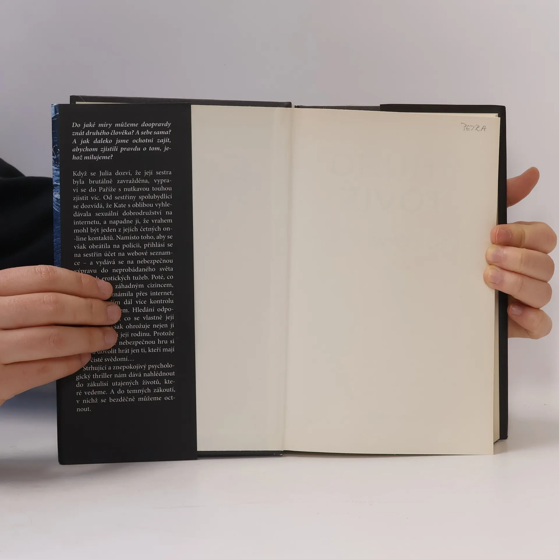 Do jaké míry můžeme doopravdy znát druhého člověka? A sebe sama? A jak daleko jsme ochotni zajít, abychom zjistili pravdu o člověku, jehož milujeme? Netrpělivě očekávaný druhý román od autora bestselleru Dřív než půjdeš spát vypráví o ženě s utajenou identitou, která má moc ji zničit. Když se Julia dozví, že její sestra byla brutálně zavražděna, vypraví se do Paříže s nutkavou touhou zjistit víc. Od sestřiny spolubydlící se dozvídá, že Kate s oblibou vyhledávala sexuální dobrodružství na internetu, a napadne ji, že vrahem mohl být jeden z jejích četných on-line kontaktů. Namísto toho, aby se však obrátila na policii, přihlásí se na sestřin účet na webové seznamce – a vydává se na nebezpečnou výpravu do neprobádaného světa vlastních erotických tužeb. Poté, co se zaplete se záhadným cizincem, s nímž se seznámila přes internet, ztrácí Julia čím dál více kontrolu nad svým životem. Hledání odpovědi na otázku, co se vlastně její sestře stalo, však ohrožuje nejen ji samotnou, ale i její rodinu. Protože tuhle smrtelně nebezpečnou hru si mohou dovolit hrát jen ti, kteří mají sami čisté svědomí… Strhující a znepokojivý psychologický thriller nám dává nahlédnout do zákulisí utajených životů, které vedeme. A do temných zákoutí, v nichž se bezděčně můžeme octnout.