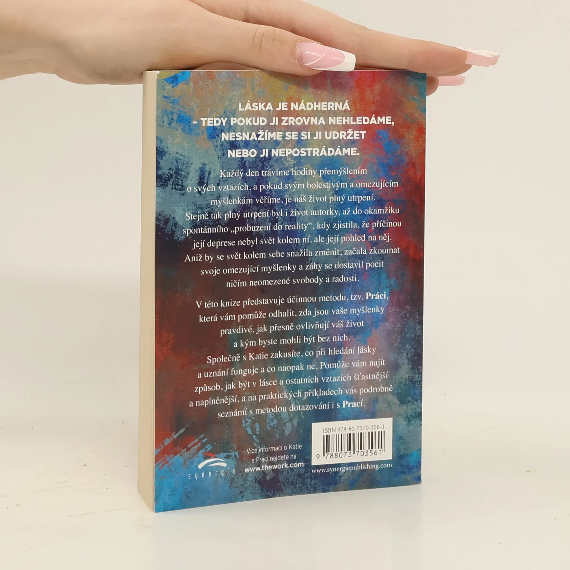 Láska je nádherná – tedy pokud ji zrovna nehledáme, nesnažíme se si ji udržet nebo ji nepostrádáme. Každý den trávíme hodiny přemýšlením o svých vztazích a pokud svým bolestivým a omezujícím myšlenkám věříme, je náš život plný utrpení. Stejně tak plný utrpení byl i život autorky, až do okamžiku spontánního „probuzení do reality“, kdy zjistila, že příčinou její deprese nebyl svět kolem ní, ale její pohled na něj. Aniž by se svět kolem sebe snažila změnit, začala zkoumat svoje omezující myšlenky a záhy se dostavil pocit ničím neomezené svobody a radosti. V této knize představuje účinnou metodu, tzv. Práci, která vám pomůže odhalit, zda jsou vaše myšlenky pravdivé, jak přesně ovlivňují váš život a kým byste mohli být bez nich. Společně s Katie zakusíte, co při hledání lásky a uznání funguje a co naopak ne. Pomůže vám najít způsob, jak být v lásce a ostatních vztazích šťastnější a naplněnější, a na praktických příkladech vás podrobně seznámí s metodou dotazování i Prací.