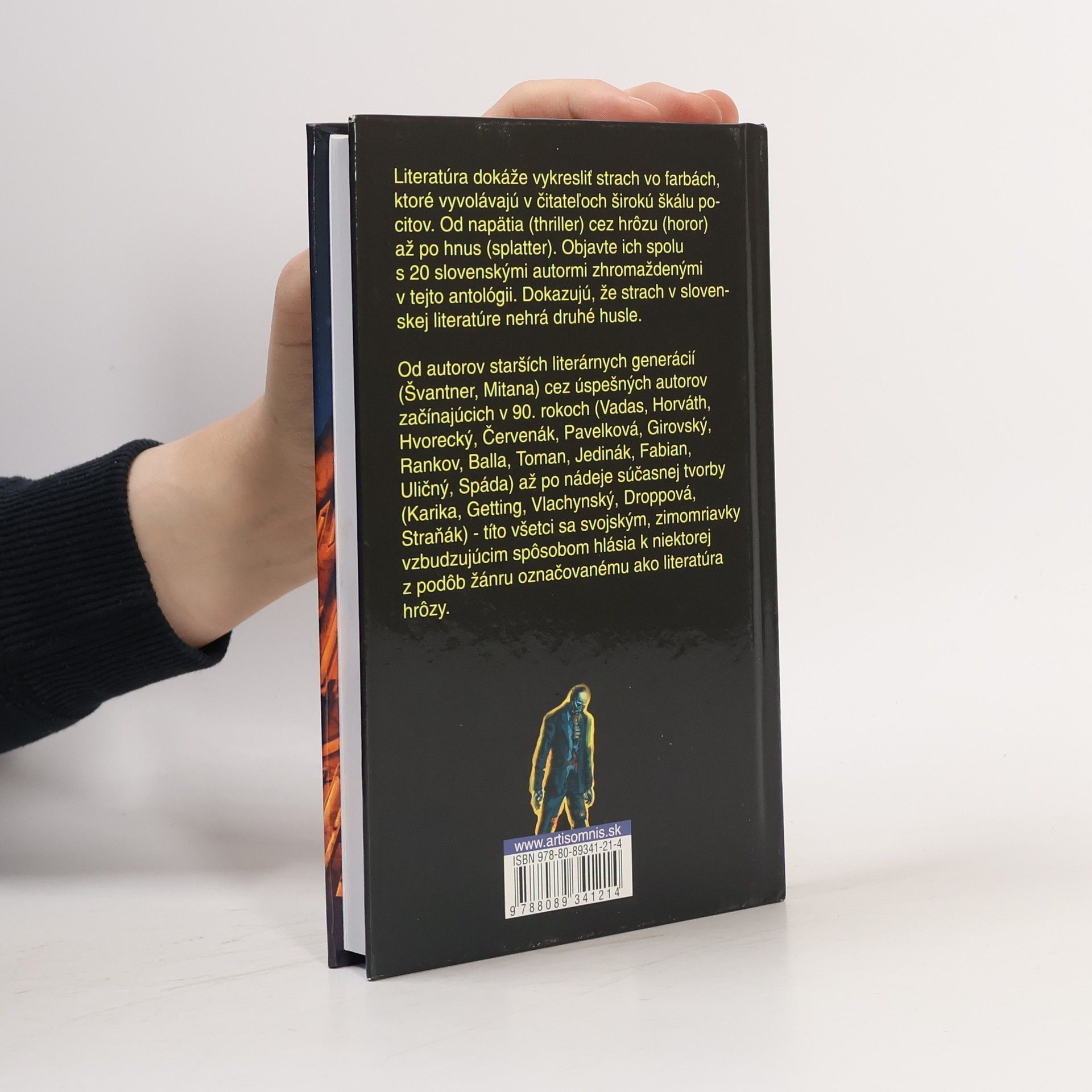 Literatúra dokáže vykresliť strach vo farbách, ktoré vyvolávajú v čitateľoch širokú škálu pocitov. Od napätia (thriller) cez hrôzu (horor) až po hnus (splatter). Objavte ich spolu s 20 slovenskými autormi zhromaždenými v tejto antológii. Dokazujú, že strach v slovenskej literatúre nehrá druhé husle. Od autorov starších literárnych generácií (Švantner, Mitana) cez úspešných autorov začínajúcich v 90. rokoch (Vadas, Horváth, Hvorecký, Červenák, Pavelková, Girovský, Rankov, Balla, Toman, Jedinák, Fabian, Uličný, Spáda) až po nádeje súčasnej tvorby (Karika, Getting, Droppová, Straňák, Vlachynský) - títo všetci sa svojským, zimomriavky vzbudzujúcim spôsobom hlásia k niektorej z podôb žánru označovanému ako literatúra hrôzy.
