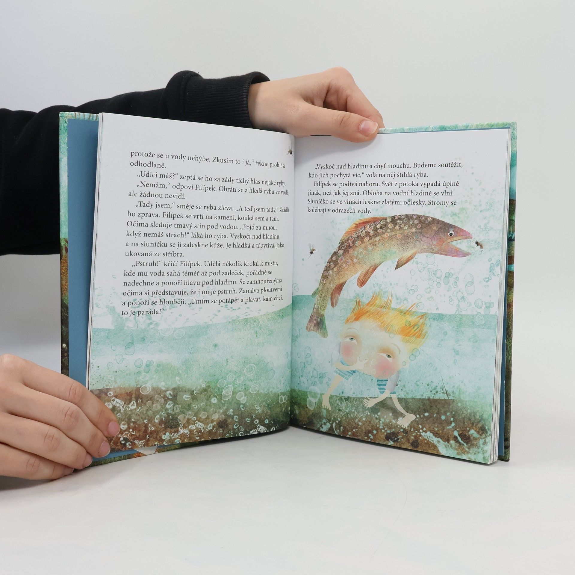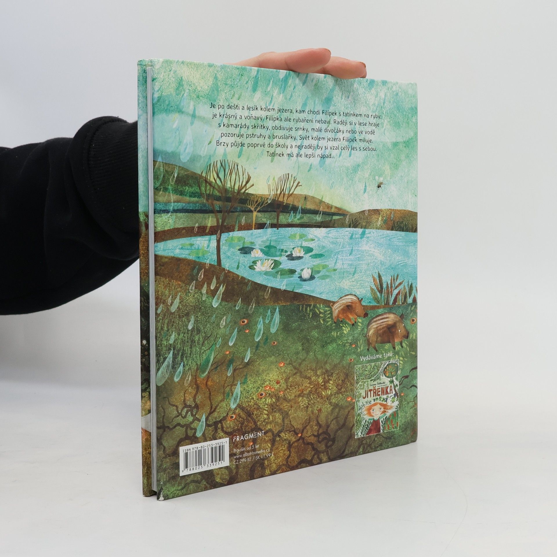 Je po dešti a lesík kolem jezera, kam chodí Filípek s tatínkem na ryby, je krásný a voňavý. Filípka ale rybaření nebaví. Raději si v lese hraje s kamarády skřítky, obdivuje srnky, malé divočáky nebo ve vodě pozoruje pstruhy a bruslařky. Svět kolem jezera Filípek miluje. Brzy půjde poprvé do školy a nejraději by si vzal celý les s sebou. Tatínek má ale lepší nápad…
