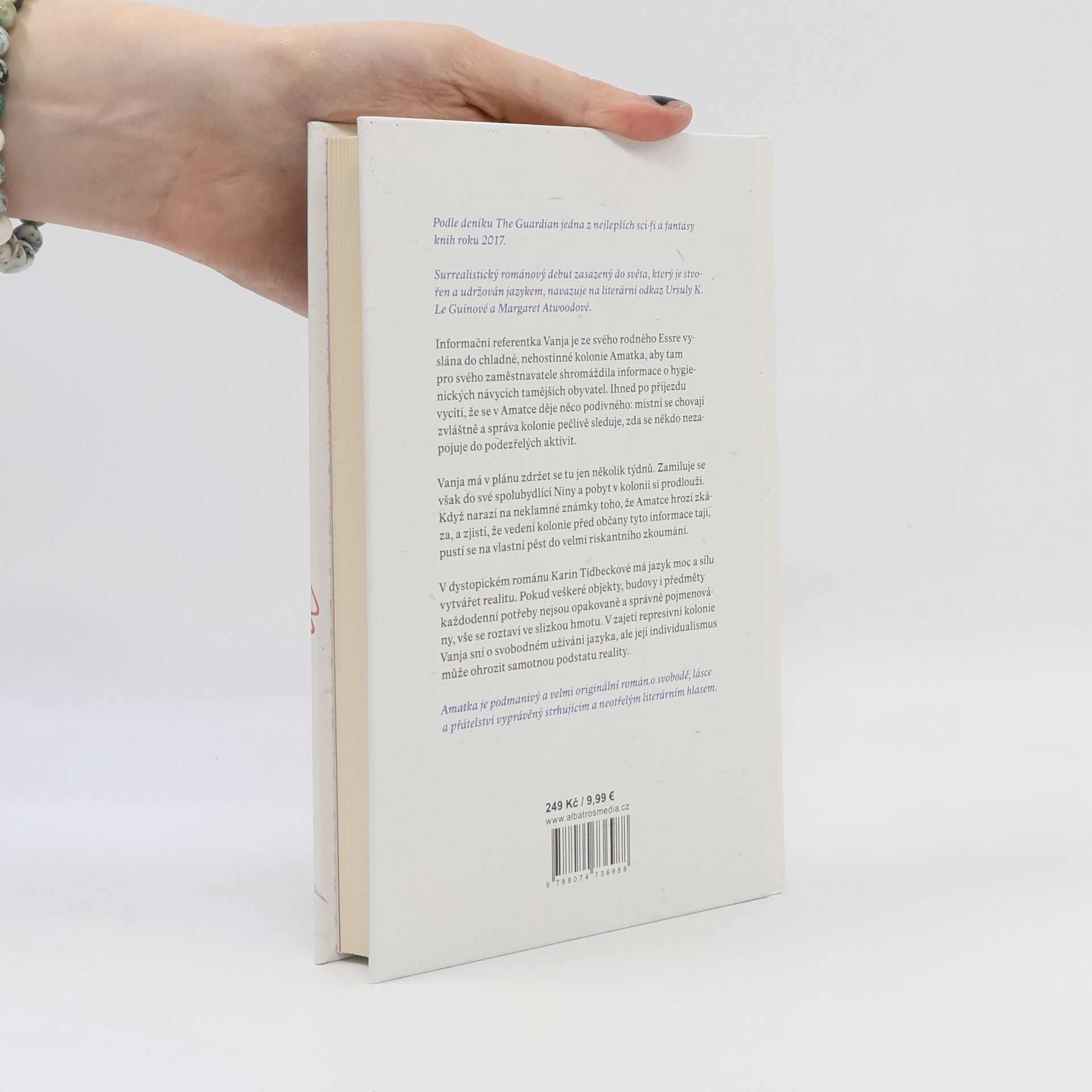 Podle deníku The Guardian jedna z nejlepších sci‑fi a fantasy knih roku 2017. Surrealistický románový debut zasazený do světa, který je stvořen a udržován jazykem, navazuje na literární odkaz Ursuly K. Le Guinové a Margaret Atwoodové. Informační referentka Vanja je ze svého rodného Essre vyslána do chladné, nehostinné kolonie Amatka, aby tam pro svého zaměstnavatele shromáždila informace o hygienických návycích tamějších obyvatel. Ihned po příjezdu vycítí, že se v Amatce děje něco podivného: místní se chovají zvláštně a správa kolonie pečlivě sleduje, zda se někdo nezapojuje do podezřelých aktivit. Vanja má v plánu zdržet se tu jen několik týdnů. Zamiluje se však do své spolubydlící Niny a pobyt v kolonii si prodlouží. Když narazí na neklamné známky toho, že Amatce hrozí zkáza, a zjistí, že vedení kolonie před občany tyto informace tají, pustí se na vlastní pěst do velmi riskantního zkoumání. V dystopickém románu Karin Tidbeckové má jazyk moc a sílu vytvářet realitu. Pokud veškeré objekty, budovy i předměty každodenní potřeby nejsou opakovaně a správně pojmenovány, vše se roztaví ve slizkou hmotu. V zajetí represivní kolonie Vanja sní o svobodném užívání jazyka, ale její individualismus může ohrozit samotnou podstatu reality.