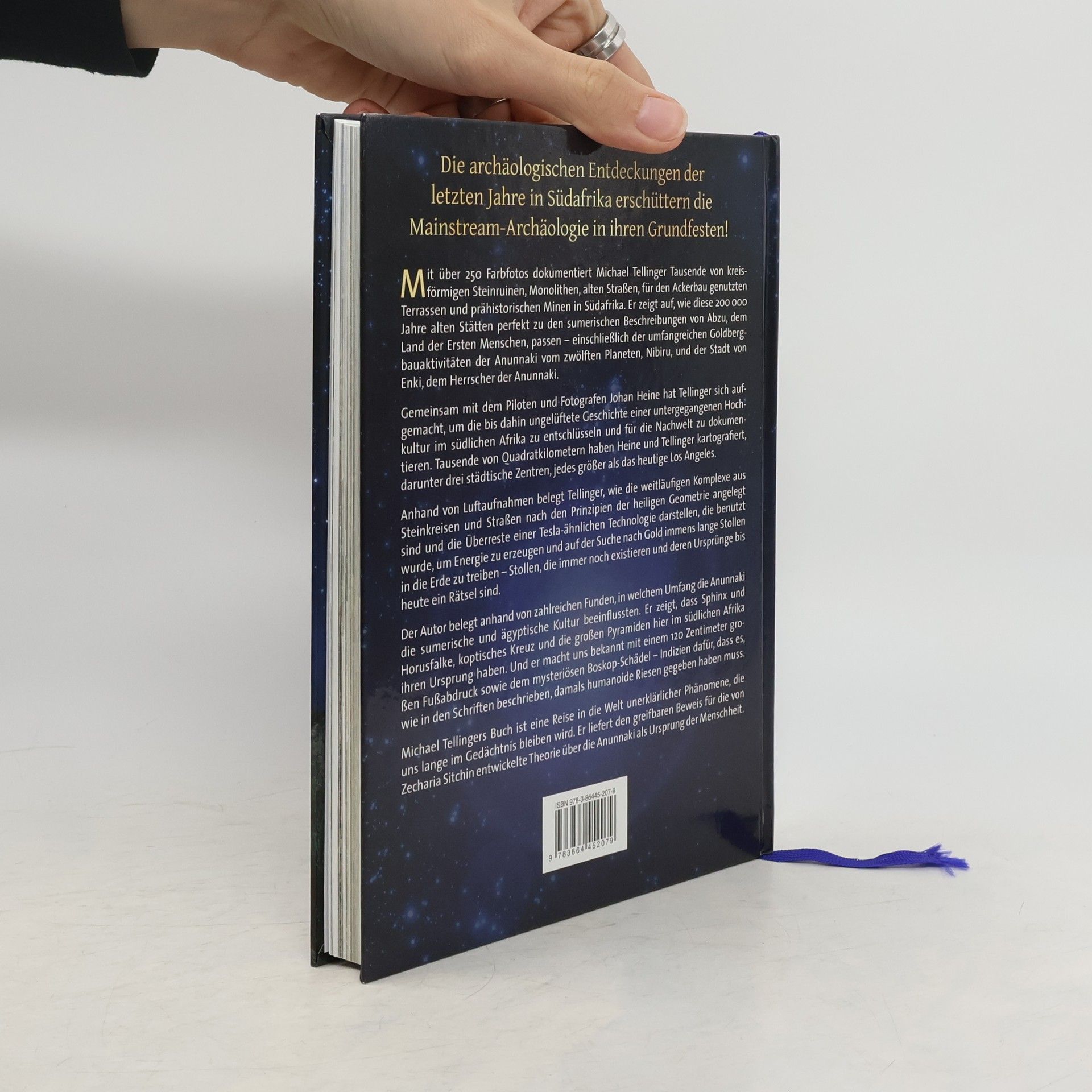Neue Entdeckungen erschüttern die Mainstream-Archäologie. Mit über 250 Farbfotos dokumentiert Michael Tellinger Tausende von kreisförmigen Steinruinen, Monolithen, alten Straßen und prähistorischen Minen in Südafrika. Diese 200.000 Jahre alten Stätten passen perfekt zu den sumerischen Beschreibungen von Abzu, dem Land der Ersten Menschen, und den Goldbergbauaktivitäten der Anunnaki vom zwölften Planeten Nibiru. Gemeinsam mit dem Piloten und Fotografen Johan Heine entschlüsseln Tellinger und Heine die Geschichte einer untergegangenen Hochkultur im südlichen Afrika. Sie kartografieren Tausende von Quadratkilometern, darunter drei städtische Zentren, die größer sind als das heutige Los Angeles. Anhand von Luftaufnahmen zeigt Tellinger, wie die Komplexe aus Steinkreisen und Straßen nach heiligen Geometrie-Prinzipien angelegt sind und Überreste einer Tesla-ähnlichen Technologie darstellen, die zur Energieerzeugung und für den Goldabbau genutzt wurde. Der Autor belegt, in welchem Umfang die Anunnaki die sumerische und ägyptische Kultur beeinflussten und zeigt, dass Sphinx, Horusfalke und die großen Pyramiden ihren Ursprung in Südafrika haben. Zudem präsentiert er einen 120 Zentimeter großen Fußabdruck und den mysteriösen Boskop-Schädel als Indizien für humanoide Riesen. Tellingers Buch ist eine faszinierende Reise in die Welt unerklärlicher Phänomene und liefert greifbare Beweise für die Theorie über die Anunnaki als Ursprung der Me