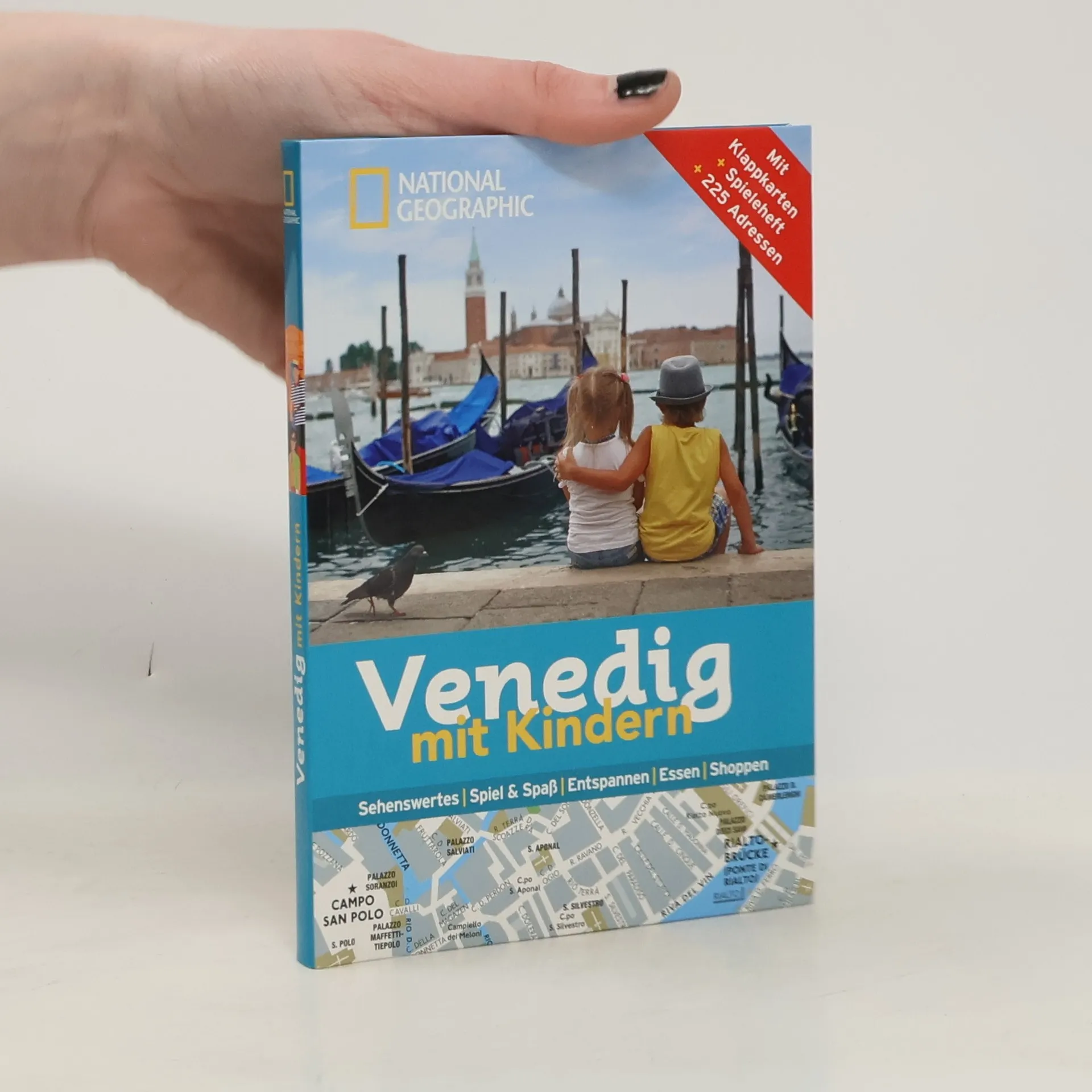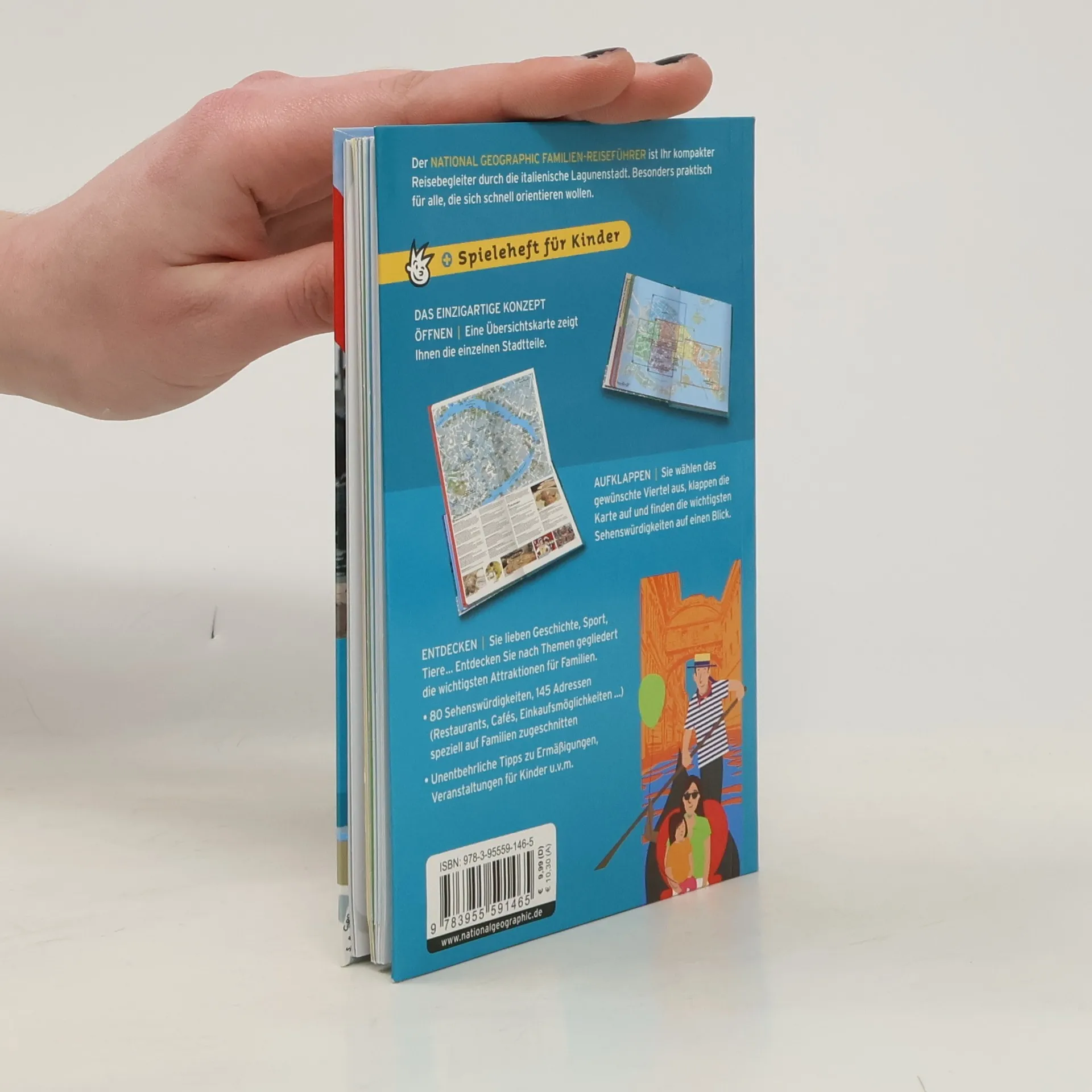 Der NATIONAL GEOGRAPHIC FAMILIEN-REISEFÜHRER ist Ihr kompakter Reisebegleiter durch die einzigartige Lagunenstadt. Besonders praktisch für alle, die sich schnell orientieren wollen. ÖFFNEN | Eine Übersichtskarte zeigt Ihnen die einzelnen Stadtteile. AUFKLAPPEN | Sie wählen den gewünschten Stadtteil aus, klappen die Karte auf und finden die wichtigsten Sehenswürdigkeiten auf einen Blick. ENTDECKEN | Sie lieben Geschichte, Sport, Tiere ... Entdecken Sie nach Themen gegliedert die wichtigsten Attraktionen für Familien. • 85 Sehenswürdigkeiten, 115 Adressen (Restaurants, Cafés, Einkaufsmöglichkeiten …) speziell auf Familien zugeschnitten • Unentbehrliche Tipps zu Ermäßigungen, Veranstaltungen für Kinder u. v. m. Inkl. Spieleheft für Kinder