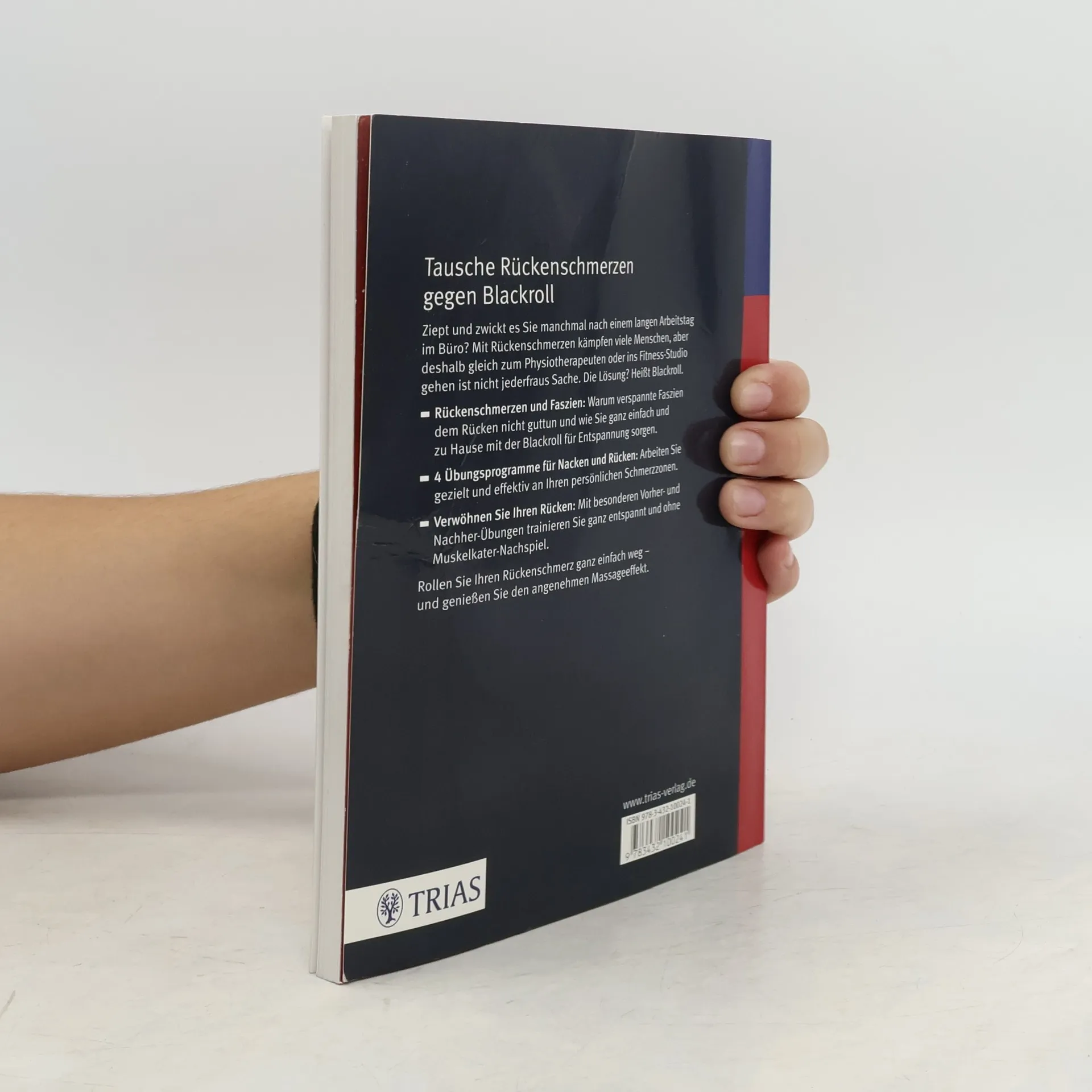 Tausche Rückentraining gegen Blackroll. Ziept und zwickt es Sie manchmal nach einem langen Arbeitstag im Büro? Mit Rückenschmerzen kämpfen viele Menschen, aber deshalb gleich zum Physiotherapeuten oder ins Fitness-Studio gehen ist nicht jederfraus Sache. Die Lösung? Heißt Blackroll. Rückenschmerzen und Faszien: Warum verspannte Faszien dem Rücken nicht guttun und wie Sie ganz einfach und zuhause mit der Blackroll für Entspannung sorgen. Vier Übungsprogramme für Nacken und Rücken: Arbeiten Sie gezielt und effektiv an Ihren persönlichen Schmerz-Zonen. Verwöhnen Sie Ihren Rücken: Mit besonderen Vorher- und Nachher-Übungen trainieren Sie ganz entspannt und ohne Muskelkater-Nachspiel. Rollen Sie Ihren Rückenschmerz ganz einfach weg - und genießen Sie den angenehmen Massageeffekt.