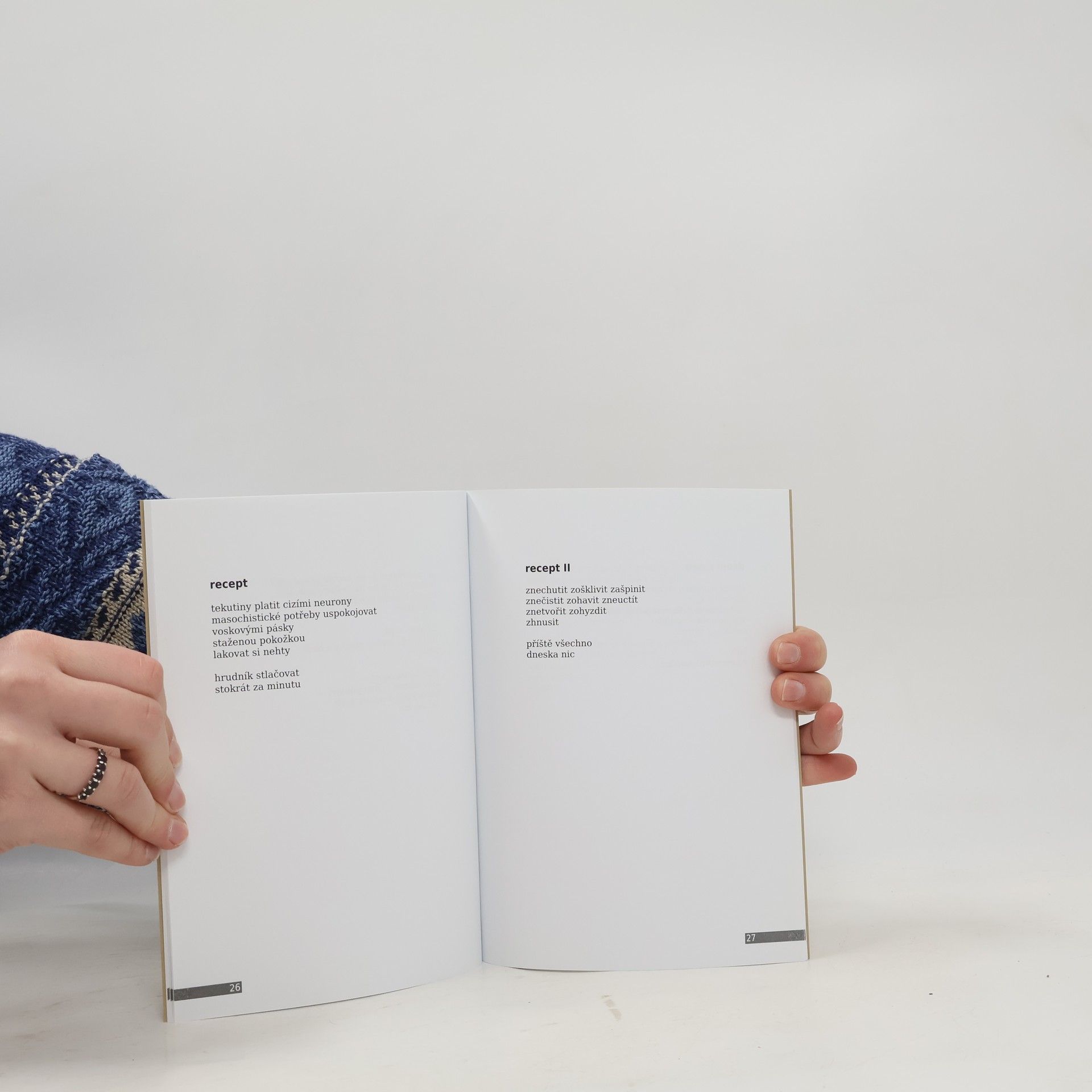 Debut polské básnířky a bohemistky Olgy Slowik lze označit i jako rozhořčený příspěvek k genderové tématice. Je ovšem nadmíru sympatické, že Olga Slowik nehledá řešení této problematiky ve feministických výlevech, snaží se však objektivně poukázat na situace, kdy se žena může cítit nedoceněna, ponížena nebo i znechucena. A tak i když zdůrazňuje zdůrazňuje svou touhu po samostatnosti či seberealizaci, zároveň povědomě touží po tom, aby jí někdo porozuměl, aby se sexuální vztah neodvíjel na pricipu mechanických pudových her, vrcholících pouze v jednostranném uspokojení.