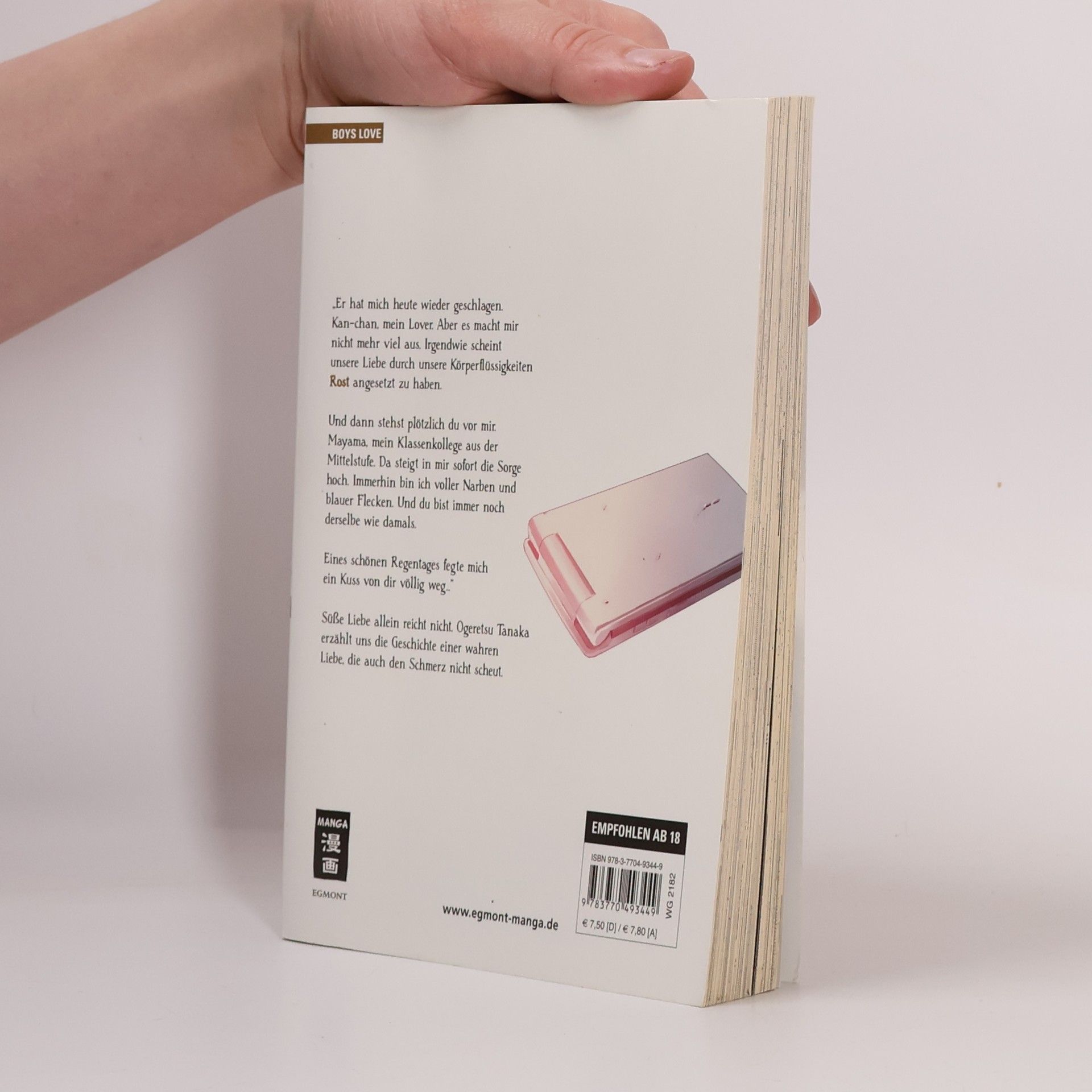 „Er hat mich heute wieder geschlagen. Kan-chan, mein Lover. Aber es macht mir nicht mehr viel aus. Irgendwie scheint unsere Liebe durch unsere Körperflüssigkeiten Rost angesetzt zu haben. Und dann stehst plötzlich du vor mir. Mayama, mein Klassenkollege aus der Mittelstufe. Da steigt in mir sofort die Sorge hoch. Immerhin bin ich voller Narben und blauer Flecken. Und du bist immer noch derselbe wie damals. Eines schönen Regentages fegte mich ein Kuss von dir völlig weg…“ Süße Liebe allein reicht nicht. Ogeretsu Tanaka erzählt uns die Geschichte einer wahren Liebe, die auch den Schmerz nicht scheut.