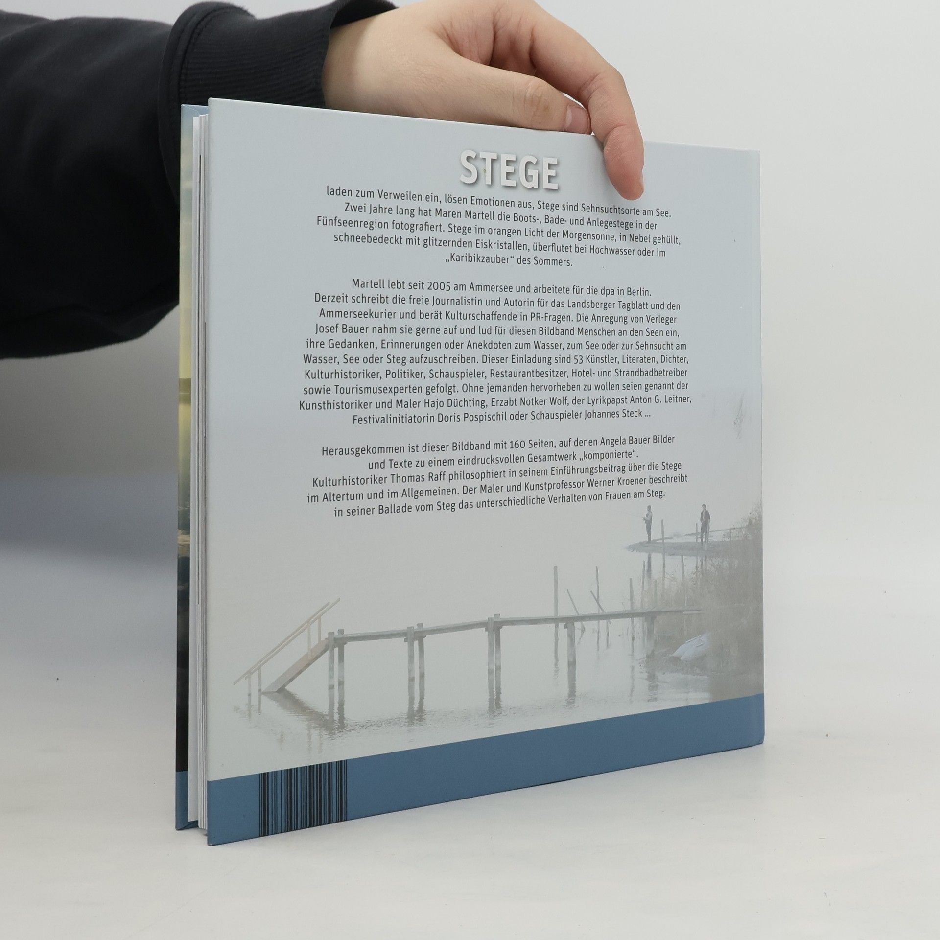 Stege am Wasser, Stege am Ufer eines unserer wunderschönen Seen: Sie sind Orte des Verweilens und der Sehnsucht. In den vergangenen zwei Jahren hat die Journalistin Maren Martell eine Vielzahl dieser Stege am Ammersee, Wörthsee, Pilsensee, Weßlingsee und Starnberger See fotografiert. Daraus ist eine Werkserie entstanden mit Stegen im bunten Herbstlicht, schneebedeckt im Winter oder im „Karibikzauber“ des Sommers. Diese Fotos sind nun in einem Bildband erschienen und mit kleinen Anekdoten, kurzen Geschichten, Gedichten oder auch nur einem Gedanken zum Thema Wasser, Verweilen am Steg oder Sehnsucht nach me(e/h)r ergänzt. Dazu haben die unterschiedlichsten Menschen aus der Fünfseenregion, darunter Künstler, Schauspieler, Fischer, Gastwirte, Bootsbesitzer, Strandbadbetreiber oder lokale Politiker einen Text beigesteuert.