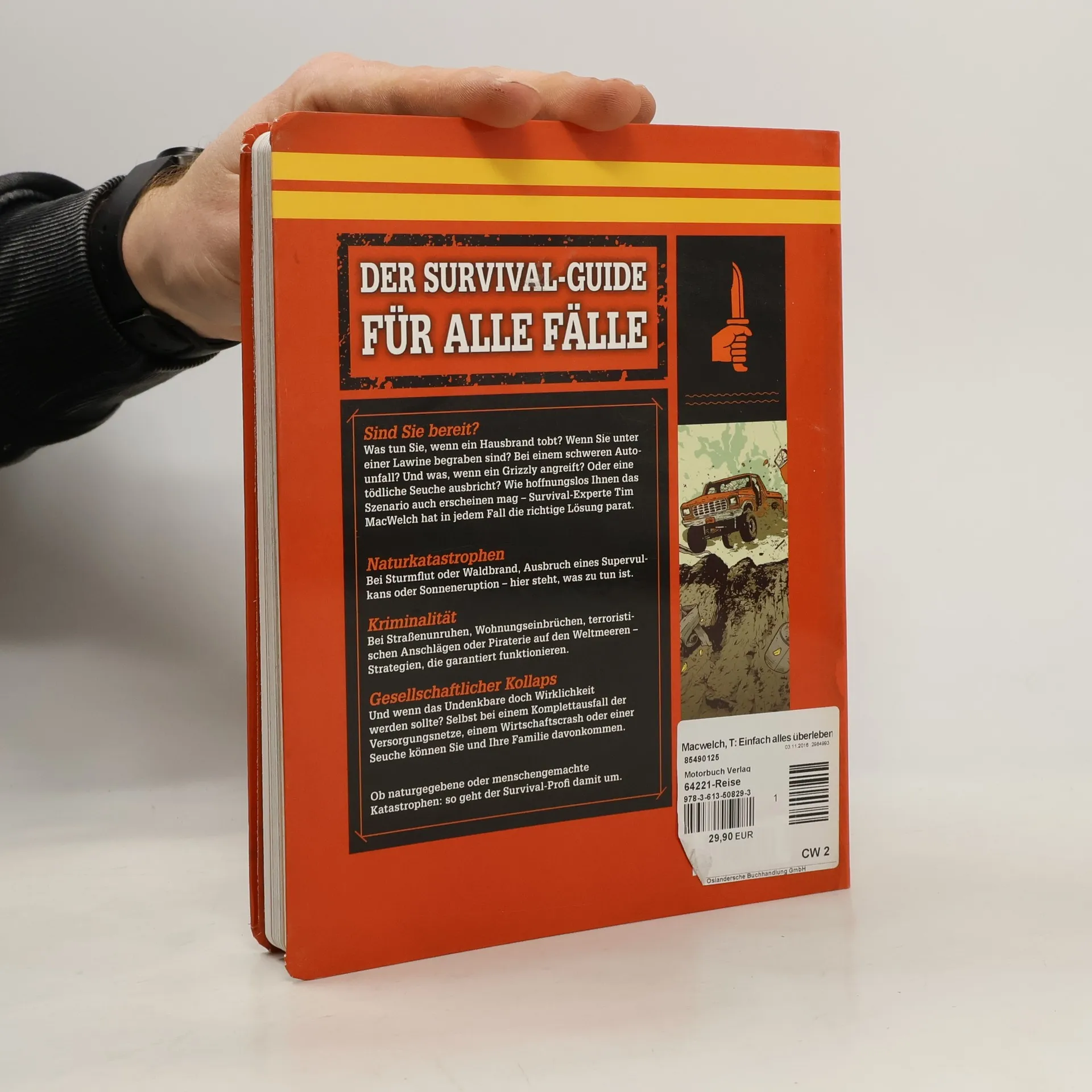 Der Outdoor-Experte Tim Macwelch hat schon so manche brenzlige Situation gemeistert. In diesem äußerst unterhaltsamen Buch gibt er mit ironischem Unterton und attraktiven Illustrationen die wichtigsten Survival-Tipps für alle, die draußen nicht nur spazierengehen wollen. Aufgeteilt ist es in die drei Bereiche: Naturkatastrophen (von Überschwemmungen bis zum Vulkanausbruch), Verbrechen (von Straßen-Unruhen über Terrorangriffe bis zur Piraterie) und gesellschaftlicher Zusammenbruch (Ausfall von Strom- und Wasserversorgung, wirtschaftlicher Zusammenbruch, Epidemien bis hin zur gefürchteten Zombie-Apokalypse). Ein Lesevergnügen der Extraklasse!